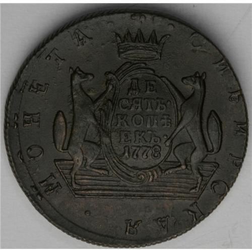 <B>Siberia. Catherine II 10 Kopecks 1778-,</B></I> Bit-1040, KM-C6, 85.9 gm, about XF with a slightly porous flan.