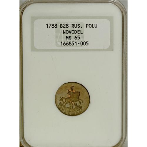 <B>Catherine II. Novodel Polushka 1788,</B></I> B-28, MS65 NGC. Well struck for the issue with a trace of original mint red color.<BR><BR><b>Shipping:</b> Coin/Currency (<a target="_blank" href="http://www.heritageauctions.com/common/shipping.php">view shipping information</a>)