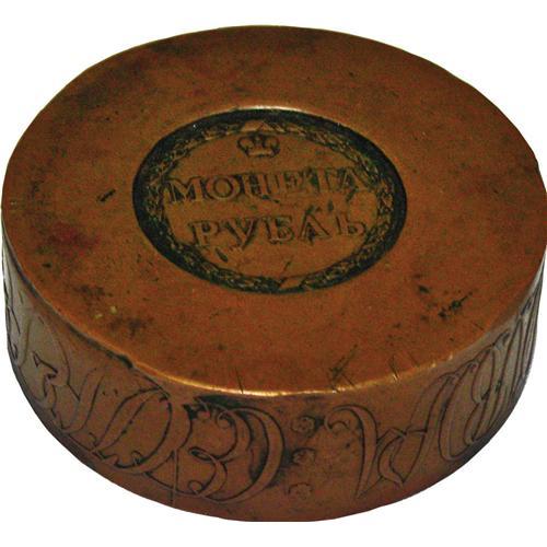 <B>Catherine II. Novodel Sestroretsk Rouble 1771,</B></I> Romanov eagle with date on breast, within wreath/Crown over value in two lines, edge with script lettering, 77 mm, 26 mm in thickness, 1041 gm, Brekke-316, numerous abrasions and edge bumps, but the details are generally VF. The largest copper coin ever issued and one of the most prized of all Russian numismatic issues.<BR><I>From the St. Petersburg Collection.</B></I>