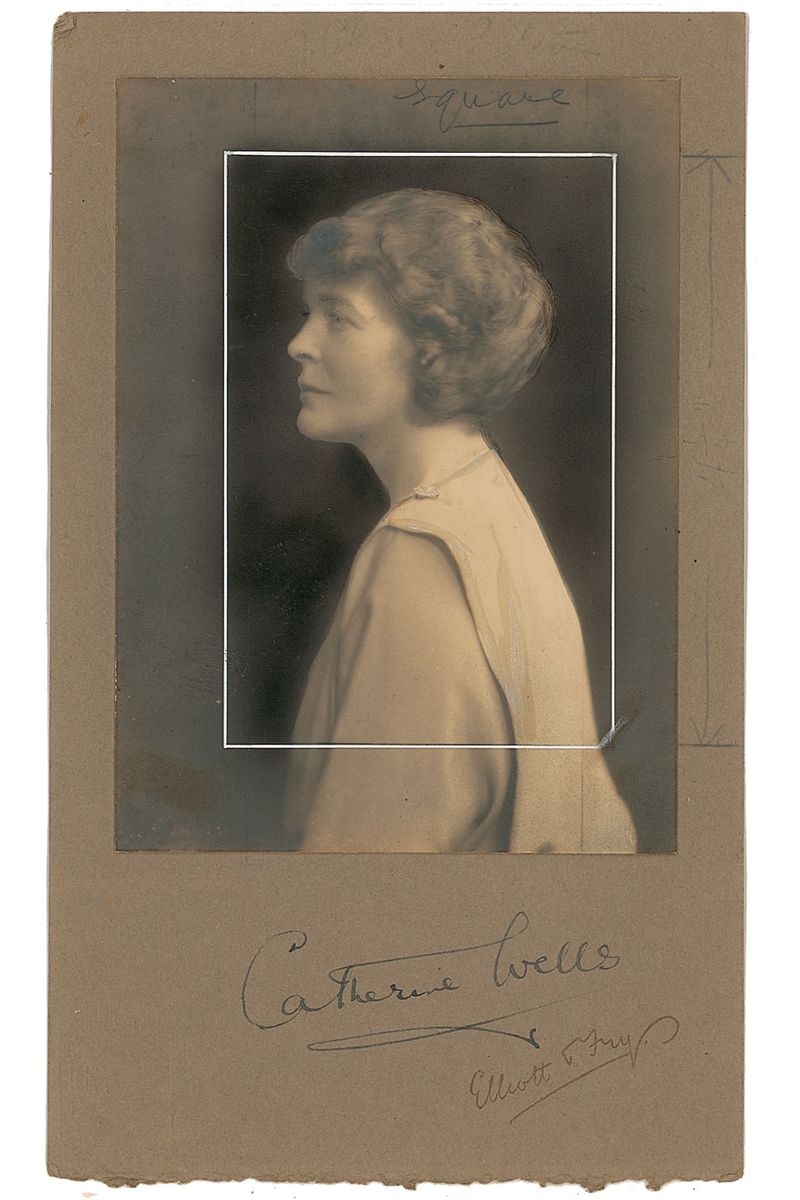 Former student and second wife of H. G. Wells. Original 3.75 x 5.25 photo by Elliott and Fry, affixed to its original 4.75 x 8 photographer’s mount, signed on the mount in black ink. In very good condition, with scattered light silvering, crop marks to image and mount, and some light touch-up to image for printing purposes.