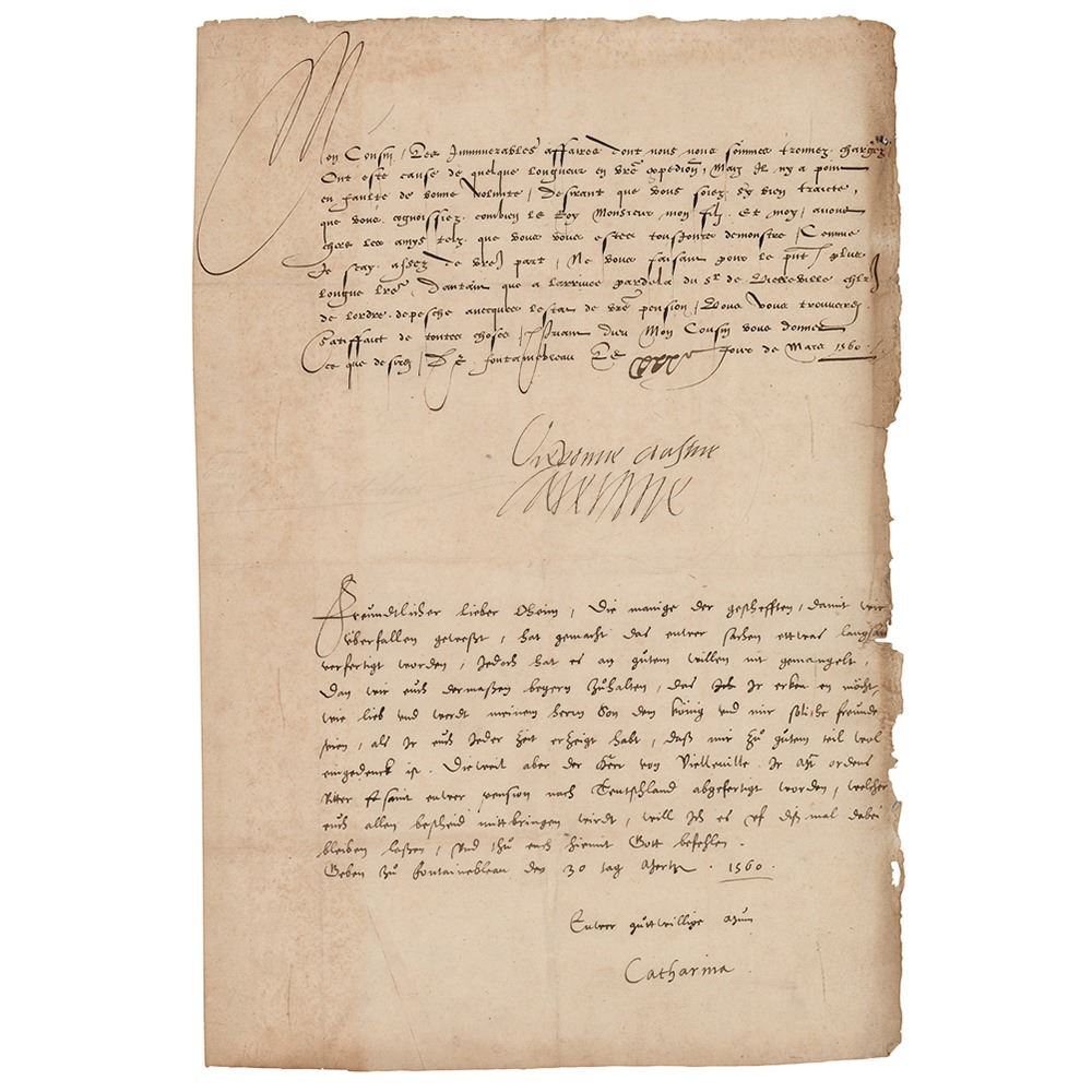 Untranslated LS in German, signed “Catherine,†one page, 8.5 x 13, March 30, 1560. The Queen addresses a letter to her cousin, admitting that she has had to neglect her cousin's affairs, but that he should realize that both she and the King value him as an ally. Her representative, Herr von Vielleville, will bring his pension to Germany and inform him of recent news. In very good to fine condition, with a few slices affecting nothing, and toning along the slightly rough right edge.