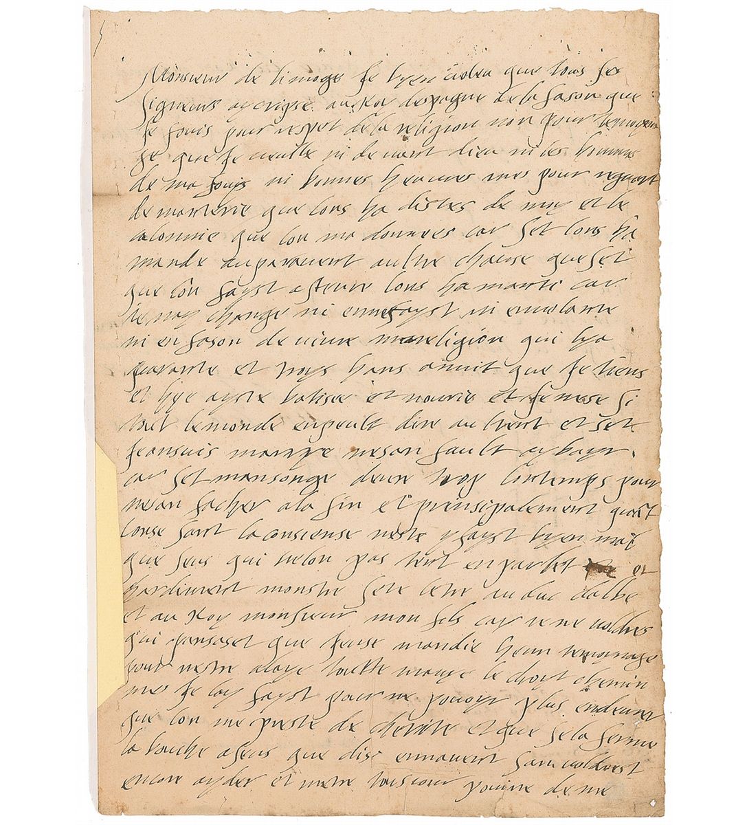 When Catherine’s son, King Francis II died in 1560, she was appointed regent on behalf of her ten-year-old son King Charles IX, giving her enormous political power. Initially hopeful that growing hostilities between Catholics and the rebelling Protestants, or Huguenots, could be quelled with compromise, she passed the controversial Edict of Saint-Germain in January of 1562, granting Huguenots private worship outside of towns. Accusations that Catherine had rejected Catholicism abounded, and she frequently defended herself as in this letter to L’Aubespine, the French Ambassador to Spain; vehemently denying that she has changed her religion, she asks that the letter be shown to her son-in-law King Philip II and his queen (her daughter, Elizabeth de Valois). Unable to ignore the hurtful slander, she writes, “I do not want them to think that I am begging for a witness, as I have been living all my life in the right way. But I did write, as I cannot stand that one talks about my attitude towards charity and I want to shut the[ir] mouths.” As the French Wars of Religion began and criticism of her leniency intensified, Catherine renounced her hopes of compromise and encouraged what would become some of the most brutal and excessive persecutions in history, including the St. Bartholomew’s Day massacre of 1572, in which thousands of Huguenots were killed throughout France. With such fervid and personal self-defense pouring from the hand of the most powerful woman in France, this is an outstanding letter in both its content and its rarity—the only Catherine ALS we have ever offered.