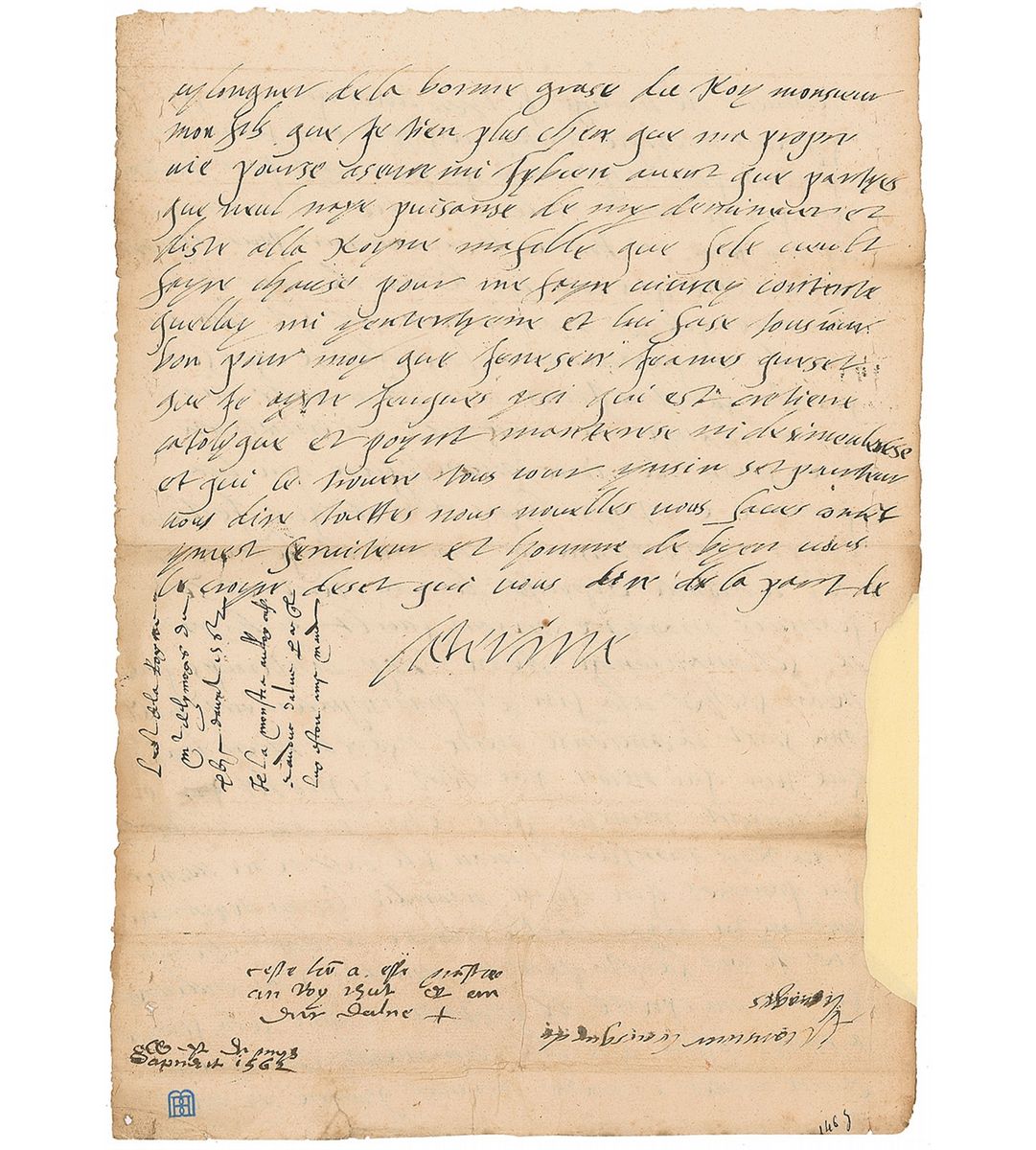 Queen Consort of France (born Florence, 1519) from 1547 to 1559 and mother of three French kings: Francis II, Charles IX, and Henry III. ALS in French, signed “Caterine,” one page both sides, 8.5 x 12, April 16, 1562. Letter to Sebastien de L’Aubespine, bishop of Limoges, defending herself against the accusation of having converted to Protestantism. In full (translated): “I accept that all these gentlemen write to the King of Spain on the way I [dis]respect the religion; not to witness what I want either before God or before men, my faith or my good works, but to talk about the lies that were told about me and slander that was made ??to me. Because it has long been told anything else than it was at this time, people lied; I have not changed or harmed or stolen, in the way I have lived my religion for forty-three years, and I called and fed and I do not know if anyone can say the same. I was married without sin, and this lie has lasted for too long not to feel angry at the end and mainly, when you feel a clear conscience and that is very bad that they talk much about that. Kindly show this letter to the Duc d'Albon and The King, my son, because I do not want them to think that I am begging for a witness, as I have been living all my life in the right way. But I did write, as I cannot stand that one talks about my attitude towards charity and I want to shut the mouths of those who invent and say, without being willing to help. And they do everything to get me away from the good graces of the King, my son, whom I consider more important than my own life. Assure me well before leaving that no power may decrease and tell the Queen, my daughter, if she wants to do something to make me happy to live, she shall talk to me and do all that is good for me, I shall always be what I have been so far, a Catholic Christian, neither a liar nor a hypocrite, and you shall always find me to be so." Intersecting folds, a thin mounting strip and small repair to left edge, and a small collector’s stamp to bottom edge of reverse, otherwise fine condition. Provenance: Christie’s 1995.