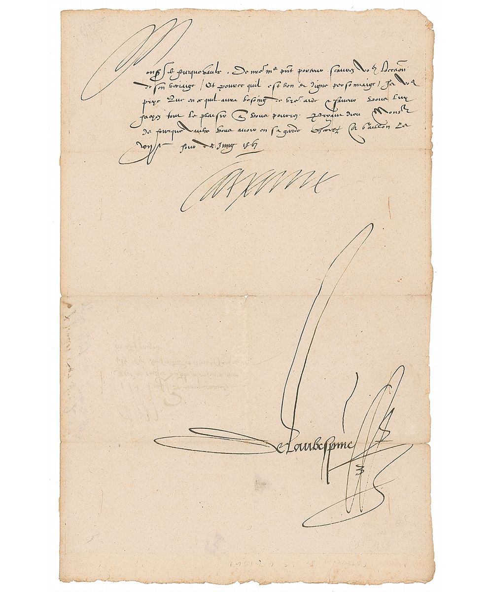 Queen of France from 1547 until 1559 as the wife of King Henry II, and mother of French kings Francis II, Charles IX, and Henry III, which granted her sweeping power over the kingdom (1519–1589). Manuscript LS in French, signed “Catherine,” one page, 9 x 13.75, June 7, 1567. Untranslated letter to Fourquevaux, the French Ambassador in Spain, with instructions relating to her daughter Elisabeth, who was married to Phllip II, King of Spain. In fine condition, with central vertical and horizontal folds (one vertical fold passing through a single letter of the signature), light edge toning, and expected document wear.
