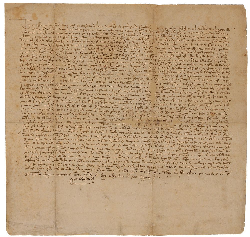 Queen of Castile (1373–1418) as the wife of King Henry III of Castile. Manuscript DS, in Latin, signed “Yo la Reyna,” one page, 13.25 x 12.75, 1407. Untranslated document signed as Regent for her son Juan II. Document has been professionally silked on the reverse. Intersecting folds, some scattered paper loss along folds affecting some of the text, scattered toning, and some reinforcement to folds on reverse, otherwise very good condition. The reverse retains its paper seal.