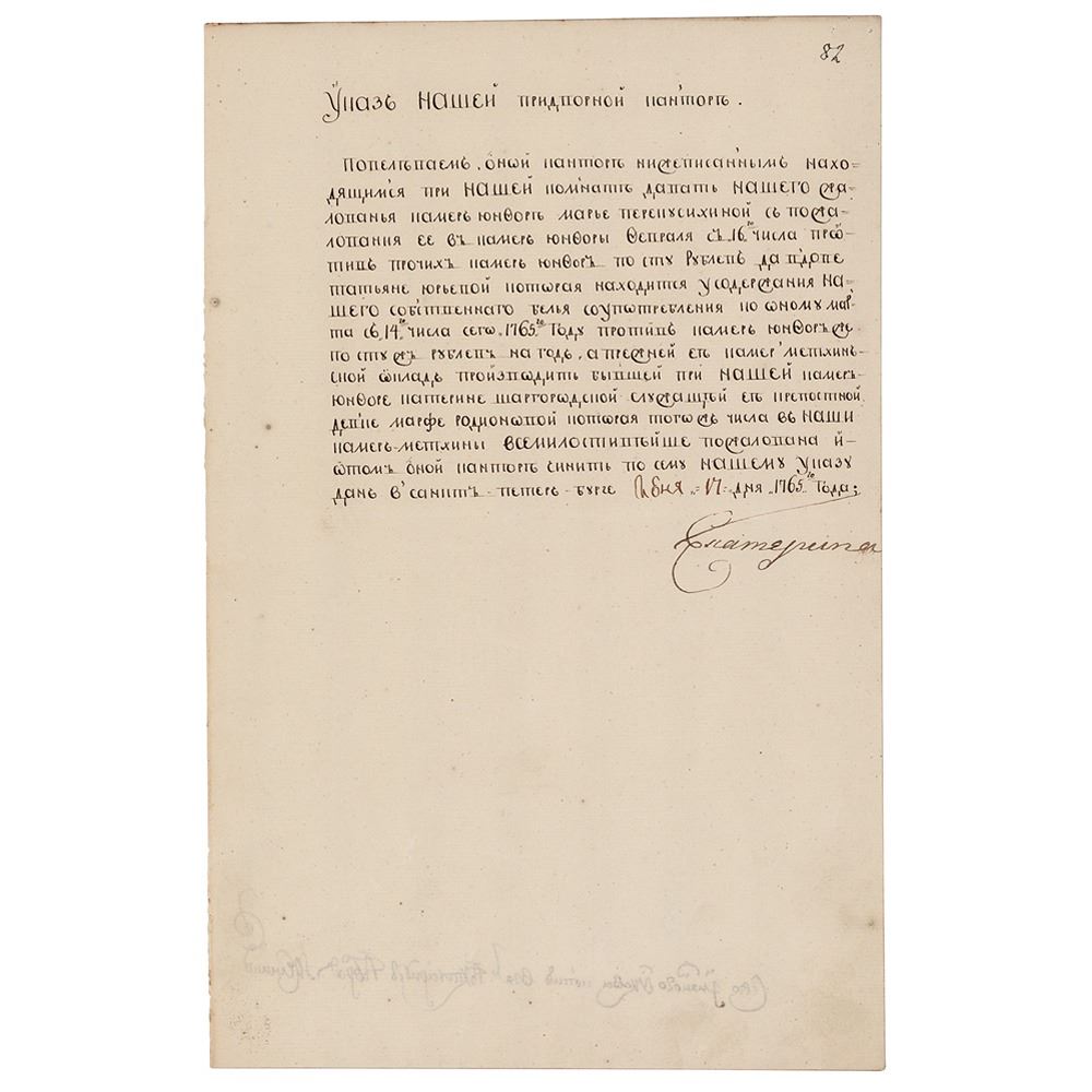 The most renowned and the longest-ruling female leader of Russia, reigning from July 9, 1762 until her death in 1796 at the age of 67. Untranslated manuscript DS in Cyrillic, signed “Ekaterina,” one page, 8 x 12.25, 1765. In fine condition.