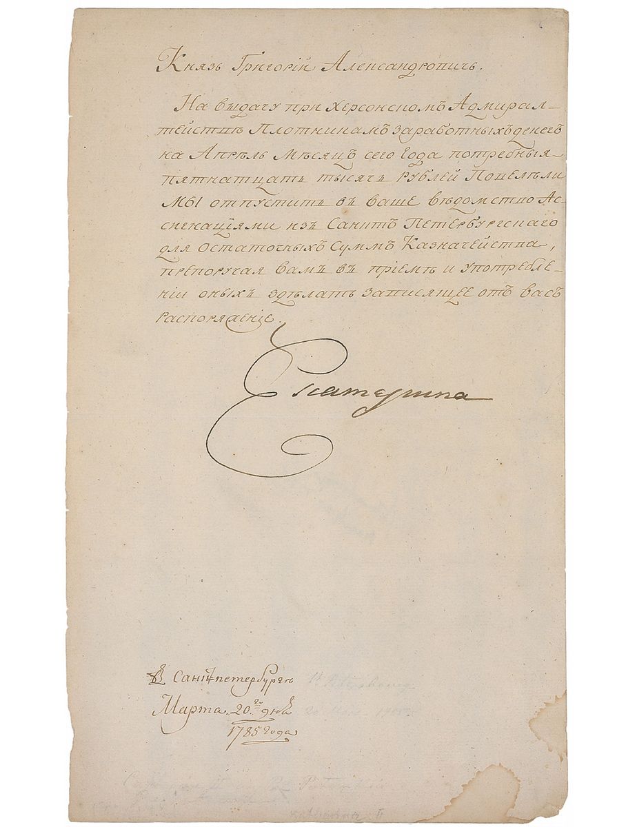 Empress of Russia, 1762–1796. She murdered her husband, Peter III, and proclaimed herself Czarina in 1762. Manuscript DS, in Cyrillic, signed “Yekaterina,” one page, 7.5 x 12.25, March 20, 1785. Document to Prince Grigoriy Aleksandrovich. In full (translated): “It is necessary that fifteen thousand rubles earned by the carpenters wages for the month of April of this year be distributed at the Kherson Shipyard. We have ordered that bank notes be released to your department from Saint Petersburg for the remaining sums from the Treasury, trusting you to receive and use them to make the disposition at your discretion.” A central horizontal fold, slightly affecting the large first letter of the signature, a light uniform shade of toning, staining to the lower right corner, a few dings to the left edge, and some erased pencil notations, otherwise fine condition.
