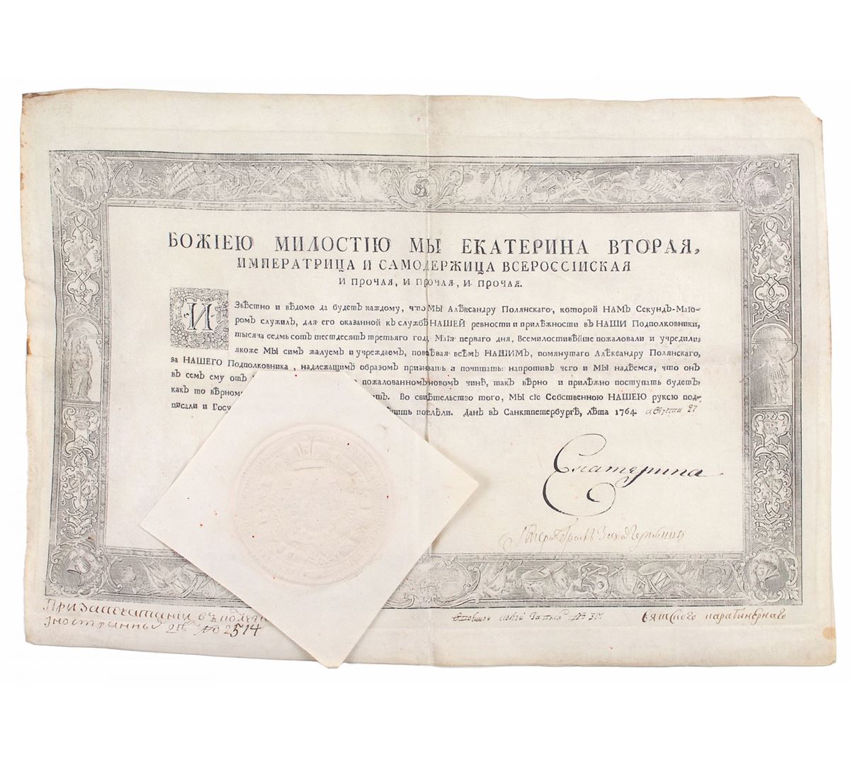 Sought-after vellum DS in Cyrillic, one page, 15.5 x 11, 1764. A military appointment for the rank of Lieutenant Colonel of the Guards given to Alexander Polyansky in 1764. Boldly signed at the conclusion by Catherine and countersigned by Count Zakhar Grigorievich Chernyshyov. The crisply embossed paper seal affixed to the lower left remains fully intact. In fine condition, with a central vertical fold and trivial soiling to edges. Accompanied by three other official documents from the same family: a 1717 manuscript document in French signed by Louis Alexandre de Bourbon, stating that nobleman Andre Polanscoy is admitted to His Royal Majesty's Navy as a garde-marine and assigned to the port of Brest; an 1835 diploma for the civilian rank of Court Councilor signed by six senators, given to Alexander Polyansky; and a circa 1870 blessing issued by the Synod in St. Petersburg and signed by Isidor Metropolitan of Novgorod and St. Petersburg, acknowledging a donation given by the landowner Alexander Polyansky to the church of the village of Makarovka. A desirable grouping topped by the attractive appointment boasting Catherine’s exceptionally bold signature.