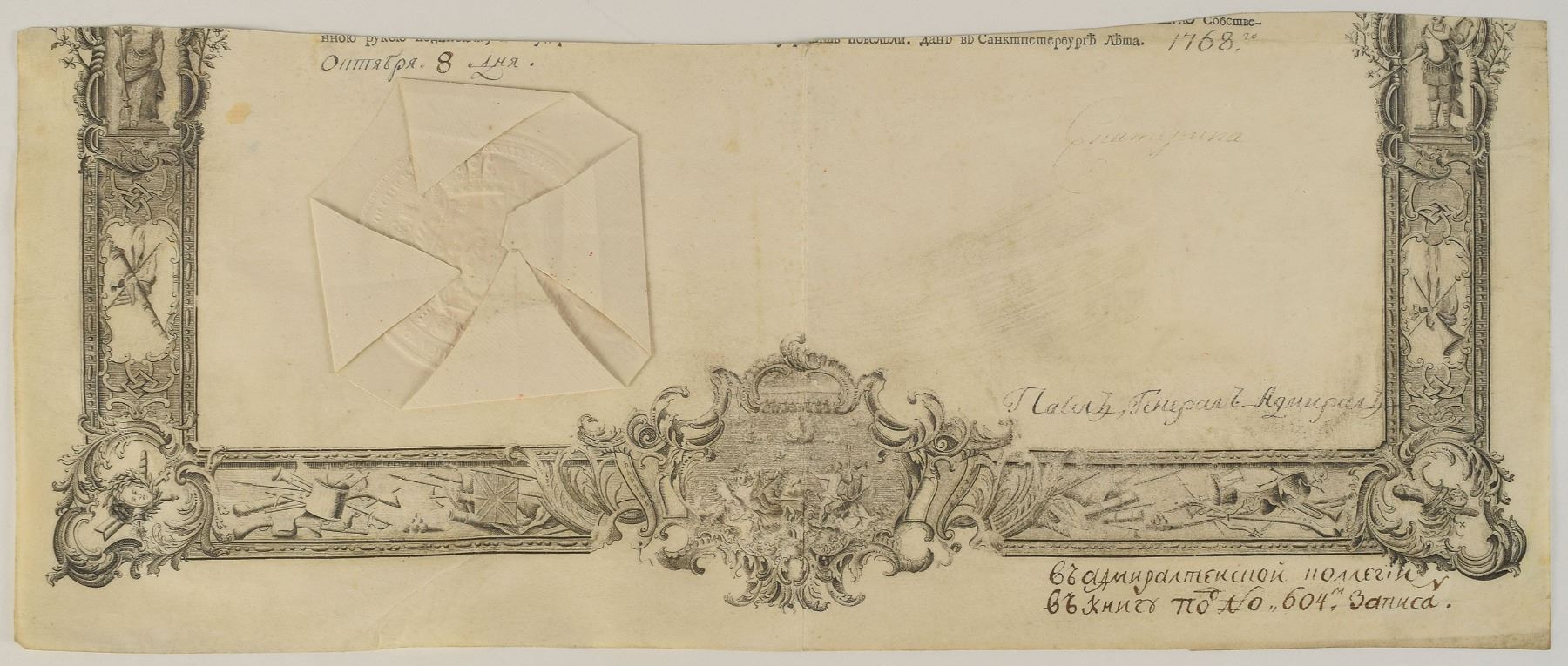 Partial partly-printed vellum DS, in Cyrillic, one page, 18.75 x 7.5, 1768. The lower portion of a larger document, retaining its beautiful crisply embossed white paper seal to the left side. The document is signed in Cyrillic by Empress Catherine of Russia, and countersigned at the conclusion by her son, Paul, in his capacity as General Admiral. The document features attractively engraved borders incorporating various decorations and vignettes. In very good to fine condition, with light soiling, a central vertical fold, and Catherine's signature very light but fully legible; Paul's signature is so faint it is almost indiscernible. Paul would succeed his mother as emperor of Russia upon her death in 1796.