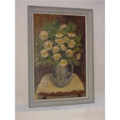 An oil painting on canvas, 29" X 20" framed. A still life of a vase of daisies on a table, well painted in an impressionist style and signed C. Dalton in the lower right corner. Condition is good, there is a tare, shown in the photo, but no chipped paint, there is some minor crazing.