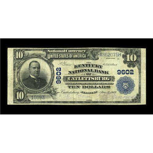 <B>Catlettsburg, KY</B></I> - $10 1902 Plain Back Fr. 627 <B>The Kentucky NB</B></I> Ch. # 9602<BR>This <B>Very Fine</B></I> note is just the fourth $10 Plain Back to surface from this institution. Nicely margined, it is also enhanced by the still visible purple stamped officers' signatures.<BR><BR><b>Shipping:</b> Coin/Currency (<a target="_blank" href="http://www.heritageauctions.com/common/shipping.php">view shipping information</a>)