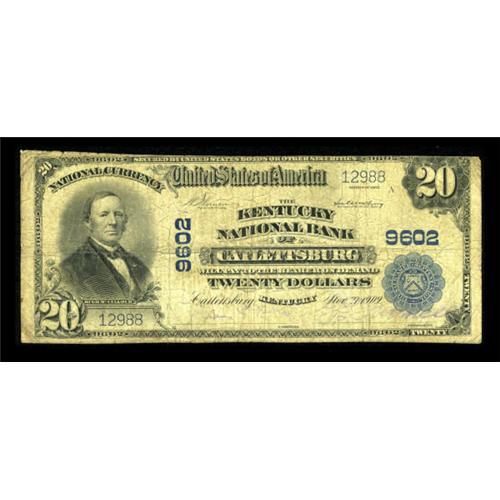 <B>Catlettsburg, KY</B></I> - $20 1902 Plain Back Fr. 653 <B>The Kentucky NB</B></I> Ch. # 9602<BR> The paper on this issue is solid, though not quite firm enough for a full Fine grade. <B>Very Good.</B></I><BR><BR><b>Shipping:</b> Coins & Currency (<a target="_blank" href="http://www.heritageauctions.com/common/shipping.php">view shipping information</a>)