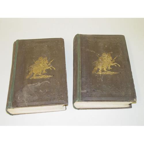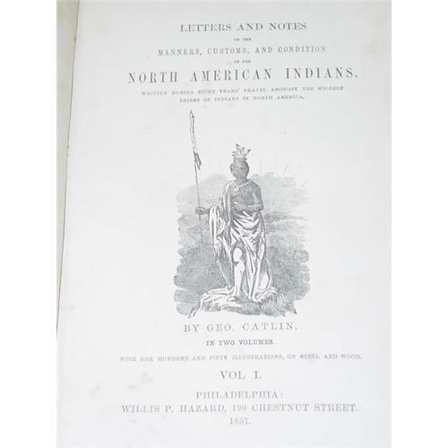 Catlin, George. Letters and Notes on the Manners, Customs and Condition of the North American Indians. Written During Eight Years' Travel Amongst the Wildest Tribes of Indians in North America - 2 Volumes. Philadelphia: Willis P. Hazard, 1857. 8vo - over 7¾" - 9¾" tall. Hard Cover. Fair to Good Condition. THIS IS NOT AN EX-LIBRARY SET. 402pp; 403-792pp, bound in original brown, blind stamped cloth, with gilt Indian on a bucking horse & gilt illustrated spines (rubbed). Frontis in each volumes, b/w with plates & text illustrations throughout. Covers show edge/corner wear, rebacked with original spines laid over, 2 hinges cracked, interior foxing, owners name on ffp. BINDINGS TIGHT