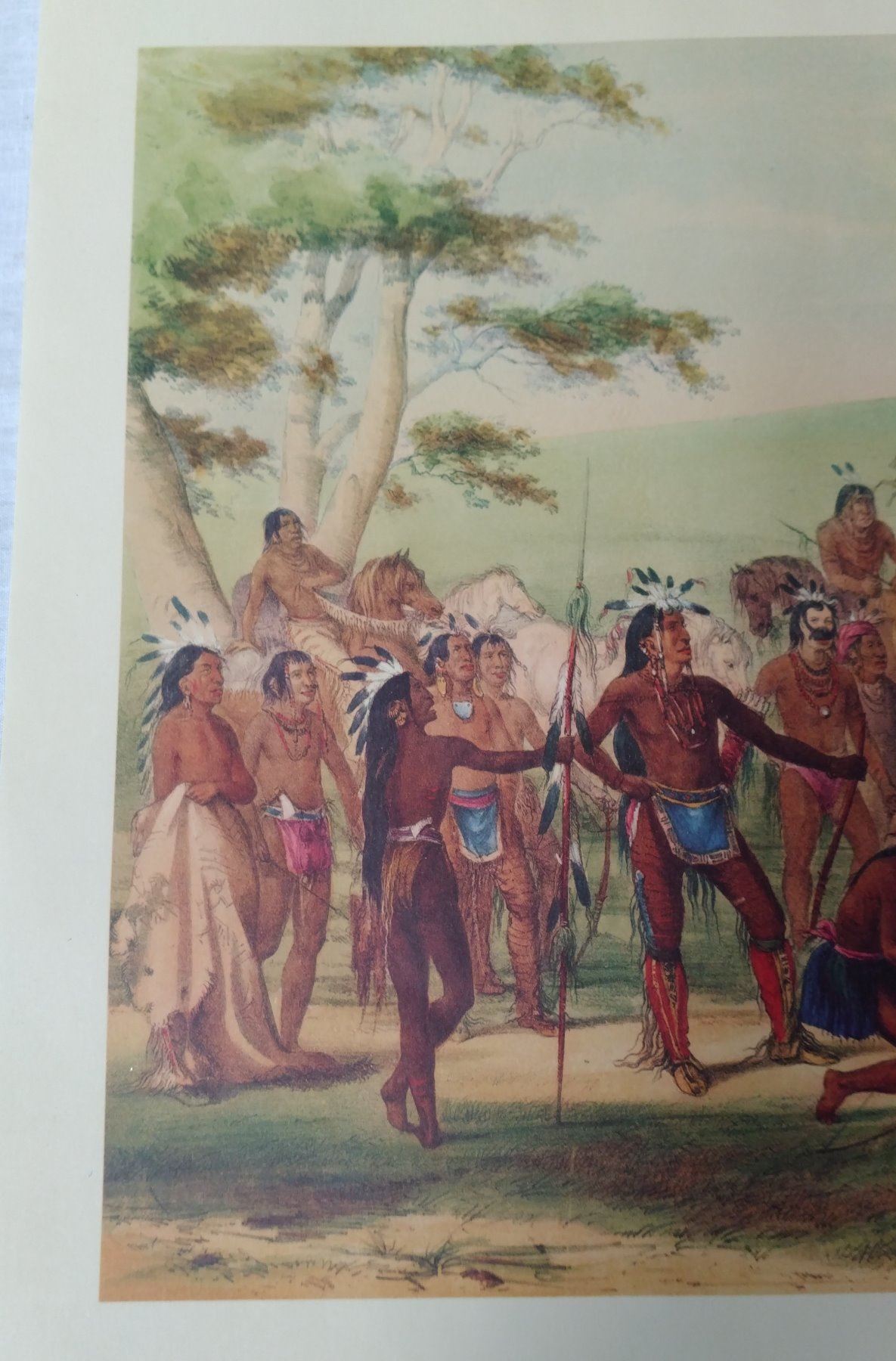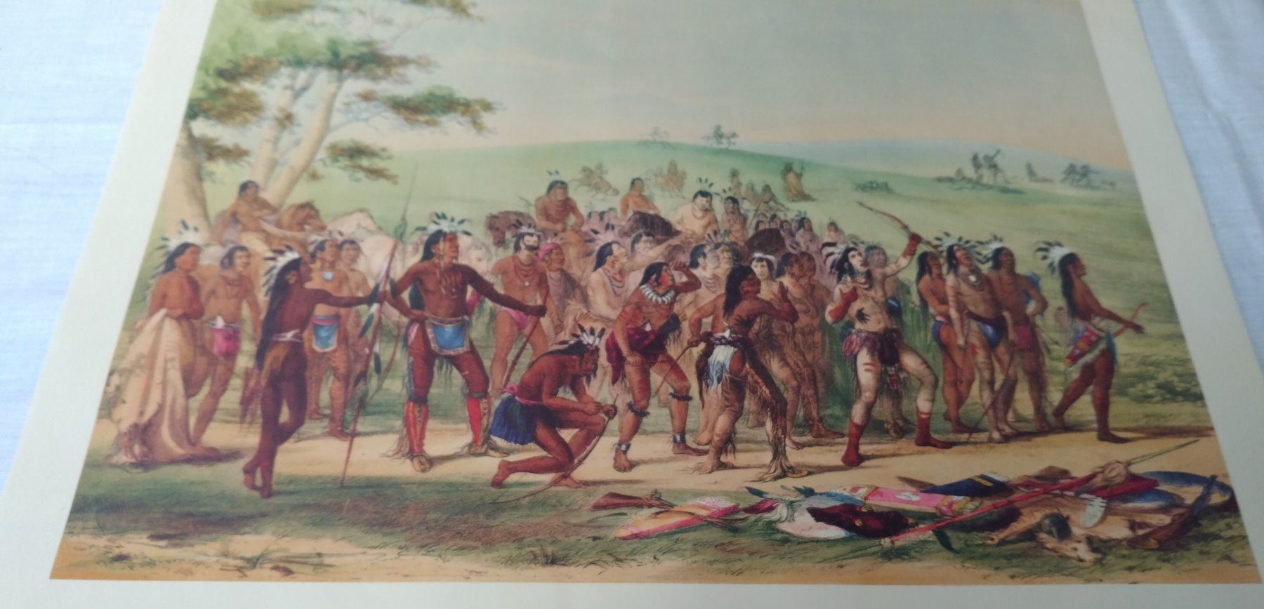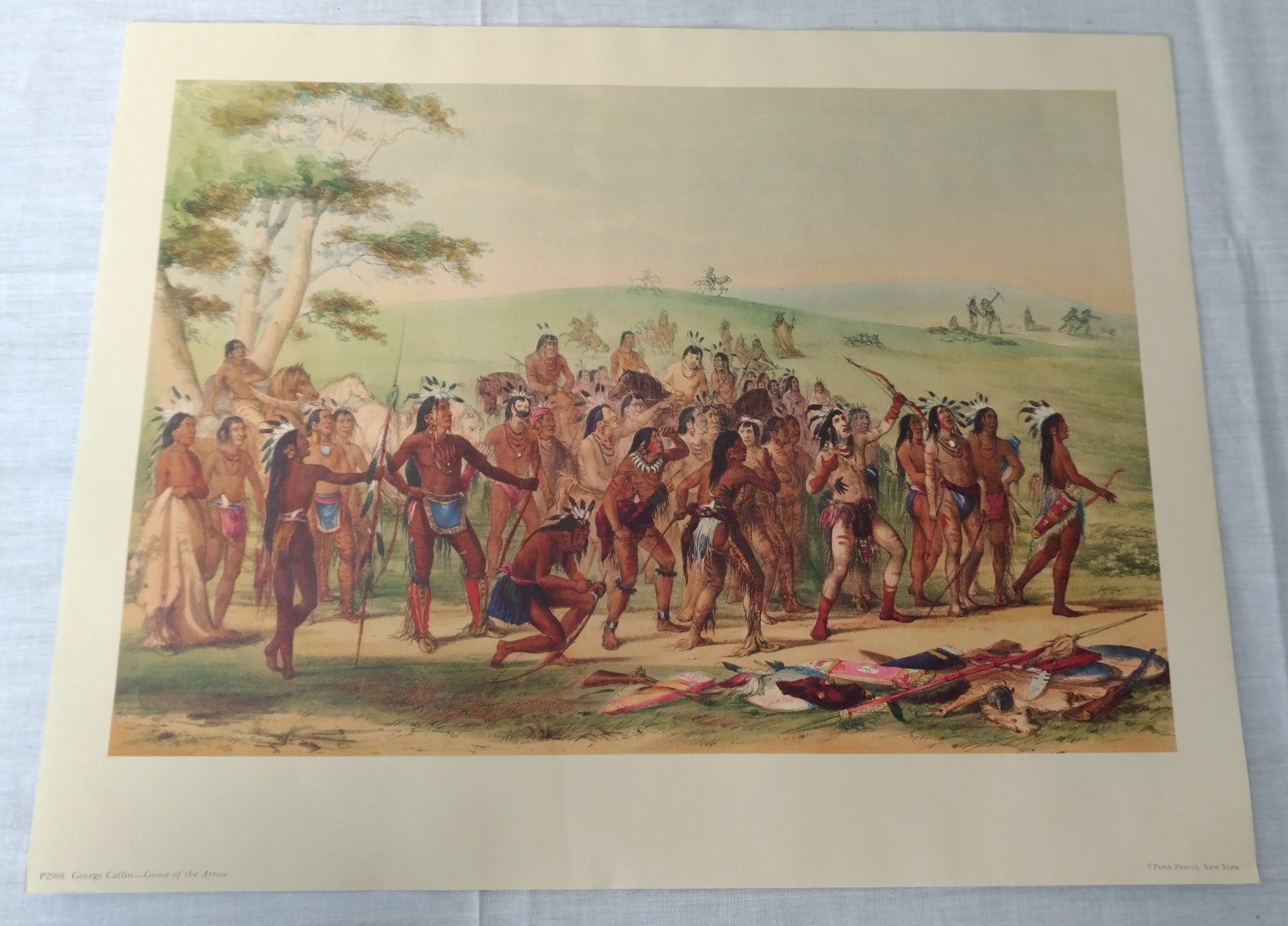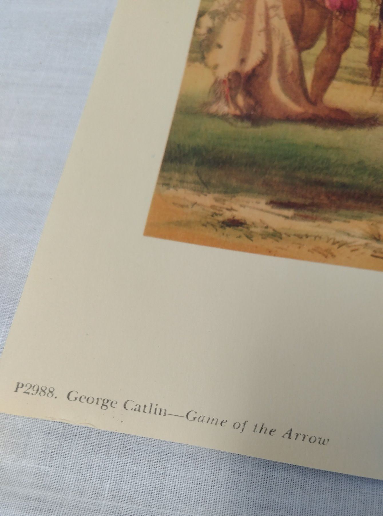 Catlin Lithograph, c. 1950. Made of paper and ink, the item measures 18" x 14", artwork measures 16" x 11". George Catlin, Penn Prints, New York. P2988. Game of the Arrow. Condition: Good, see images. Shipping: $14.50 w/insurance and signature.