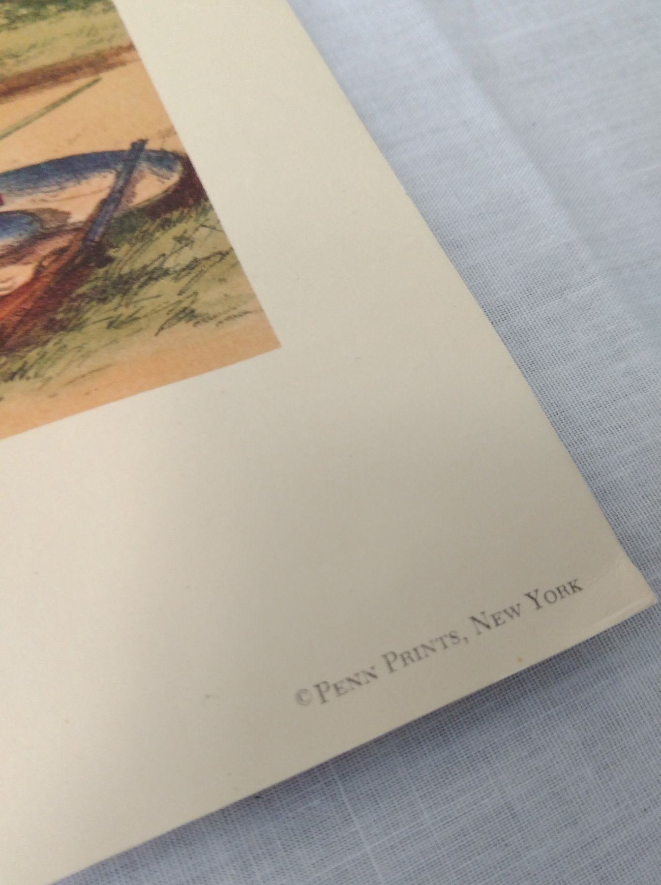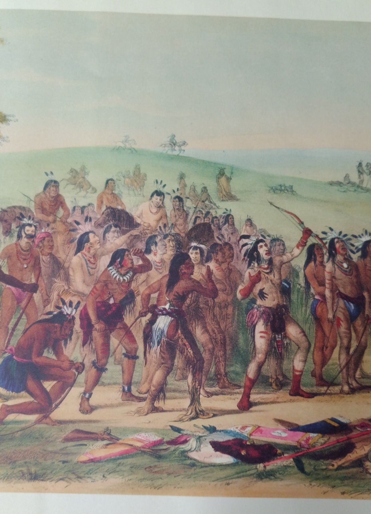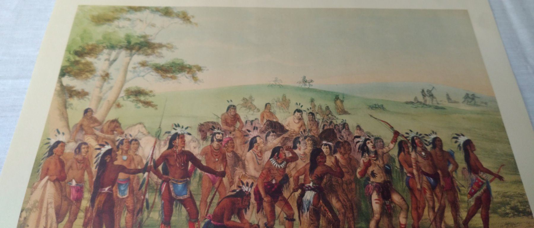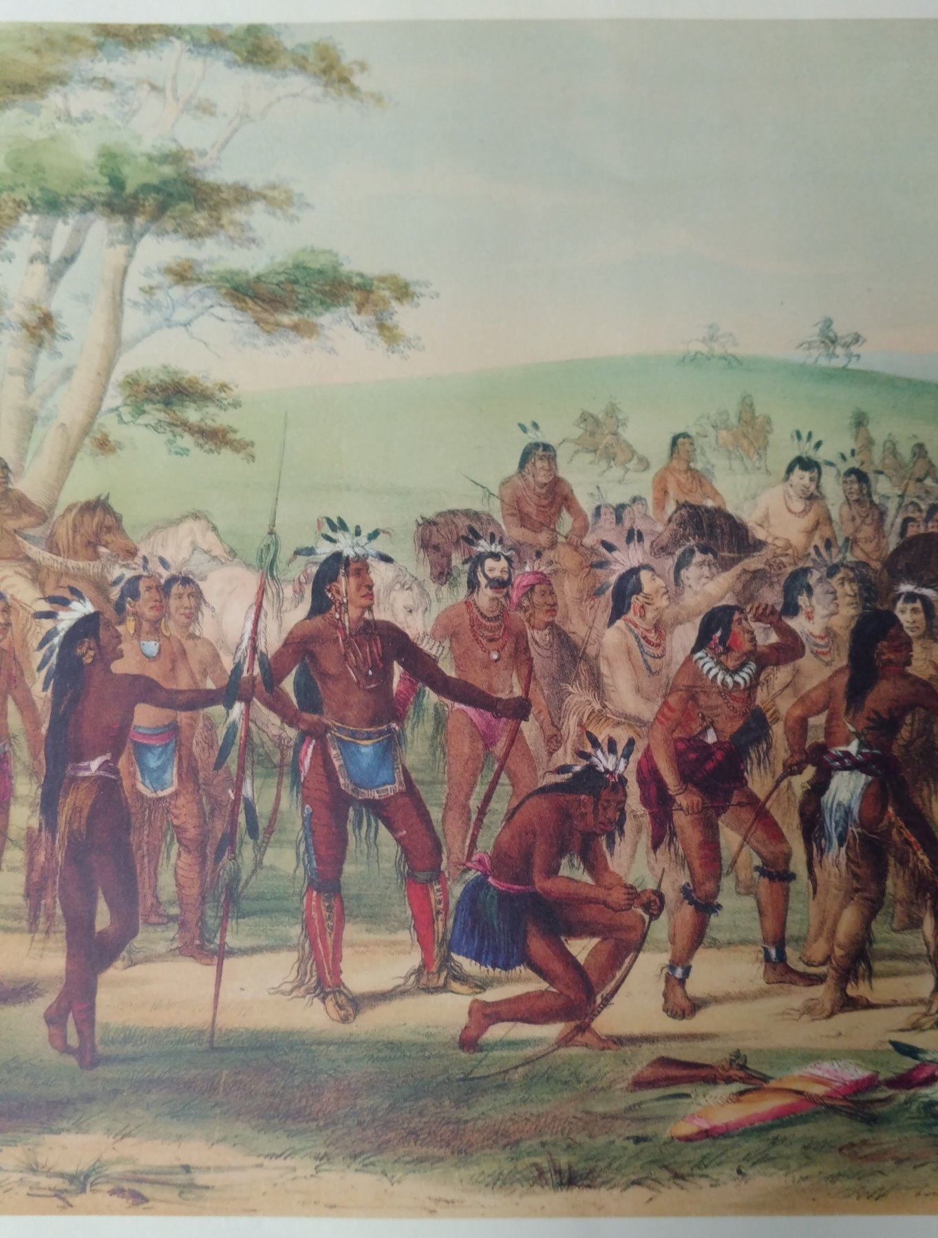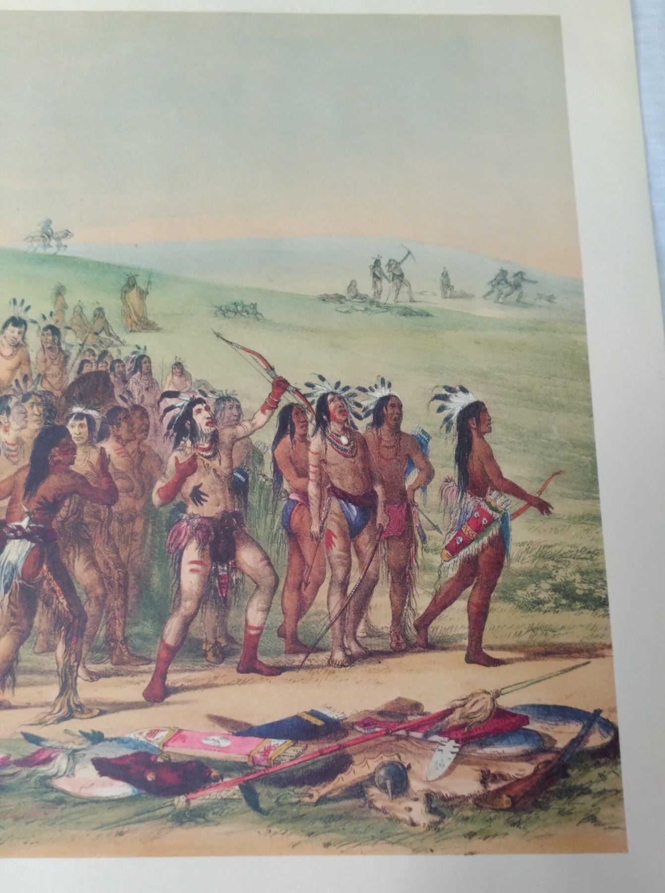 Catlin Lithograph, c. 1950. Made of paper and ink, the item measures 18" x 14", artwork measures 16" x 11". George Catlin, Penn Prints, New York. P2988. Game of the Arrow. Condition: Good, see images. Shipping: $14.50 w/insurance and signature.