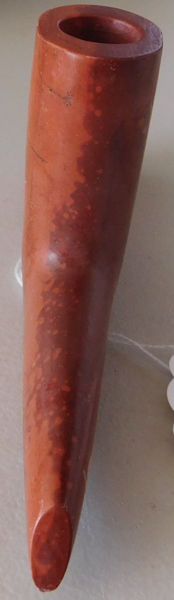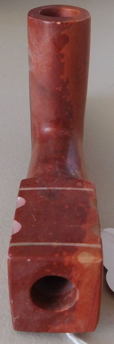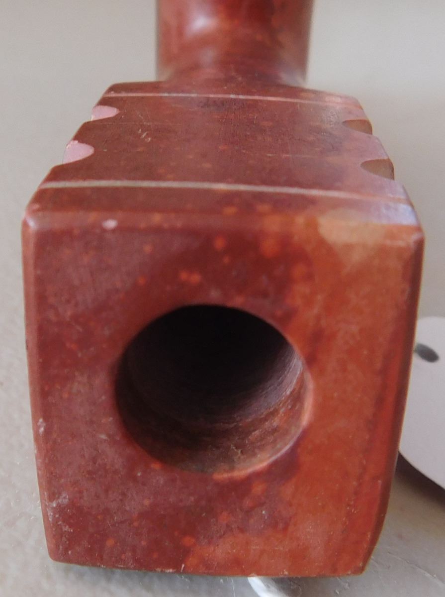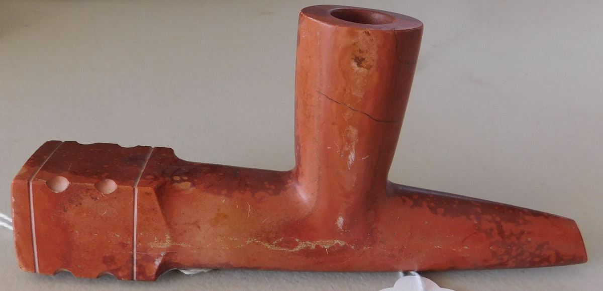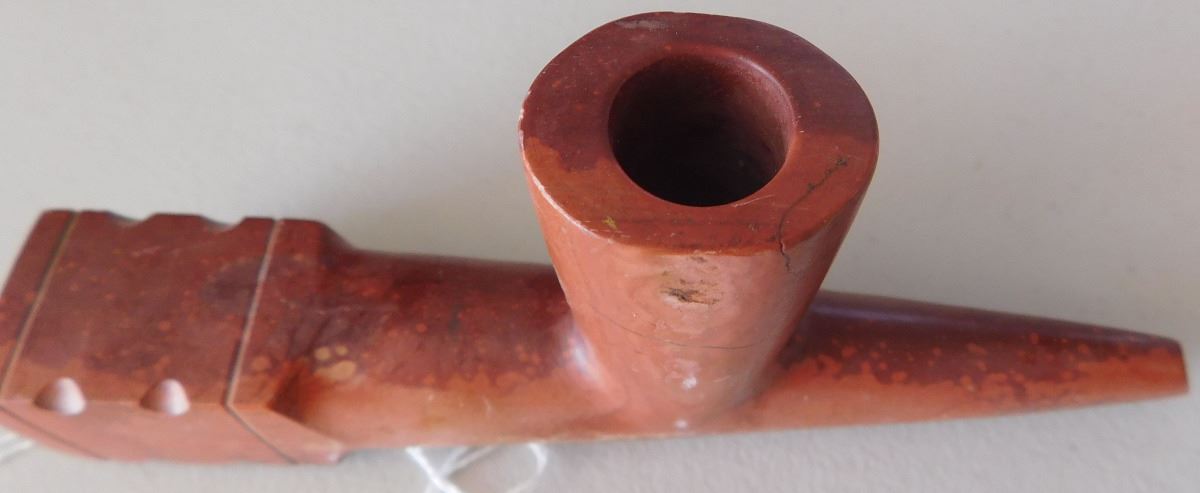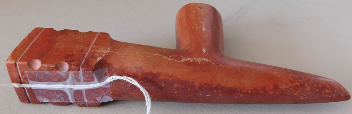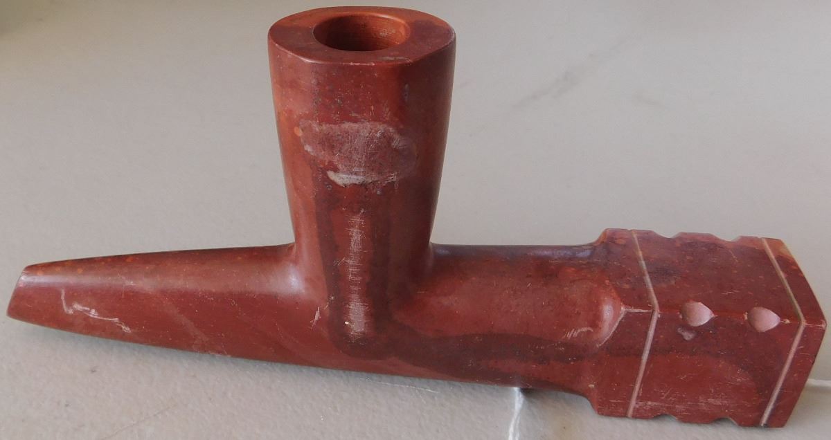 Catlinite Pipe Bowl, late 19th century. Carved of catlinite, this item measures 6.25" x 2.75". Sioux, from the Dakotas. Condition: Some sunburn damage on one side, see images. Shipping: $15.50.