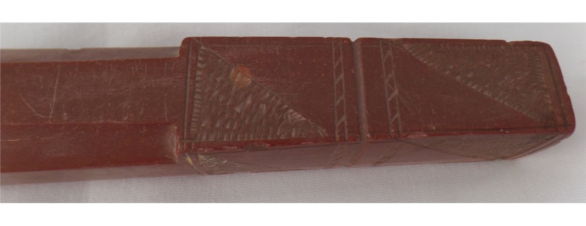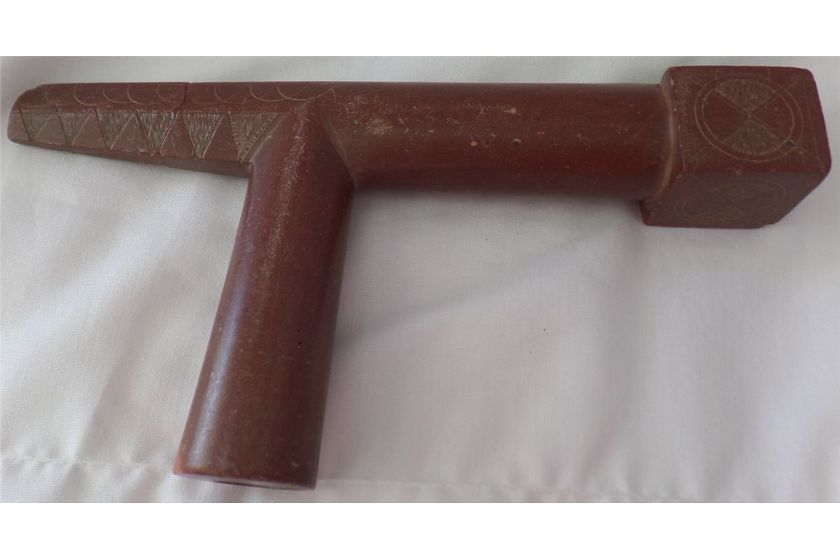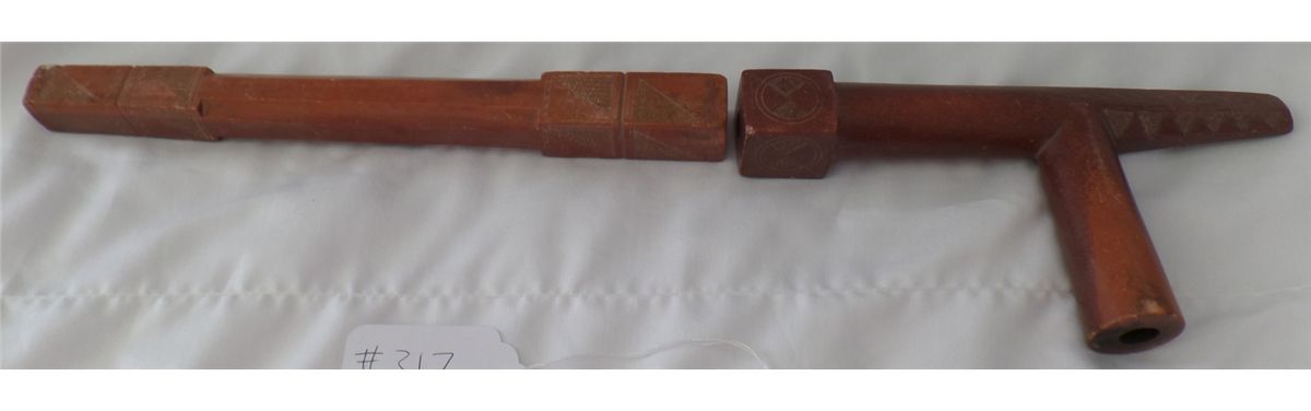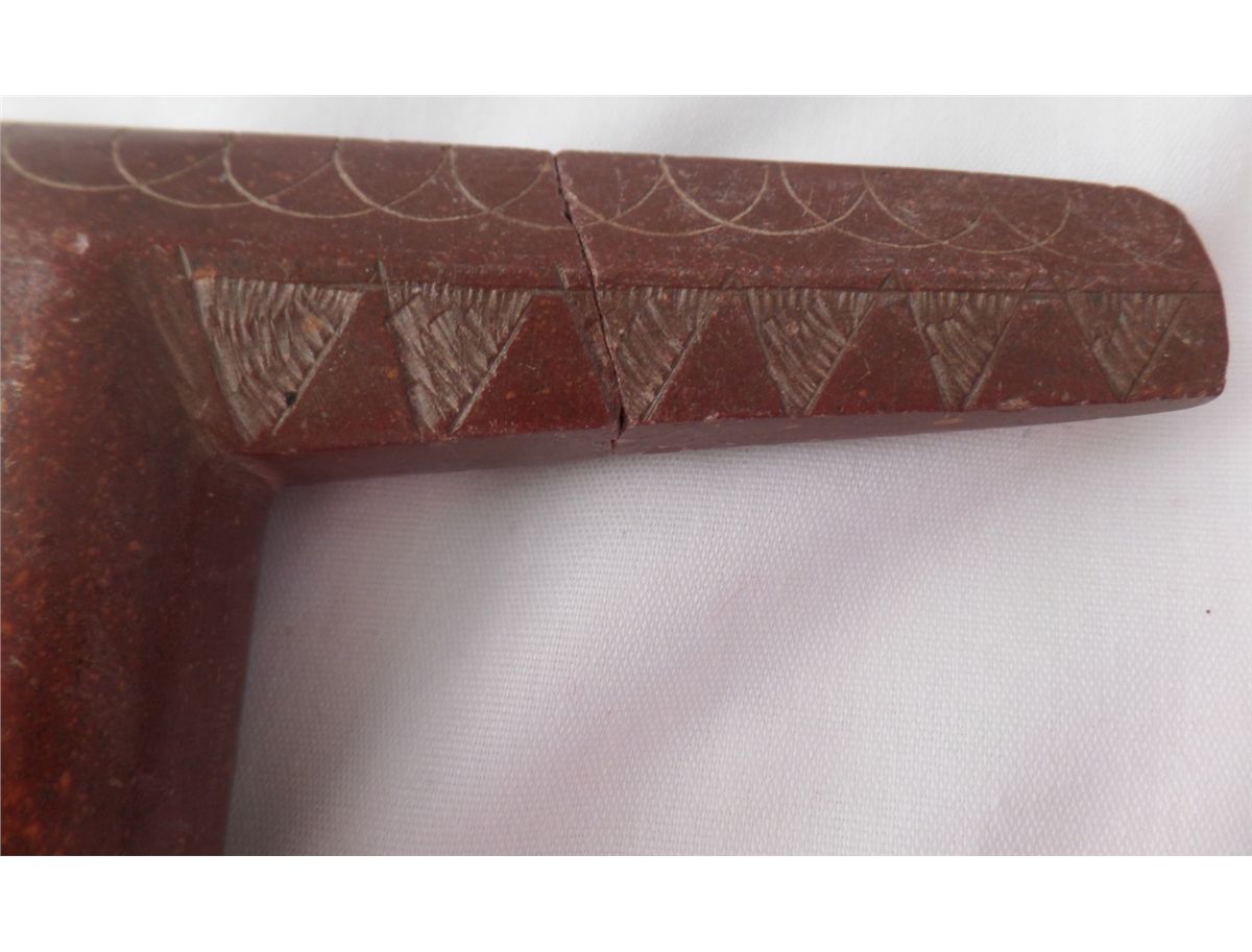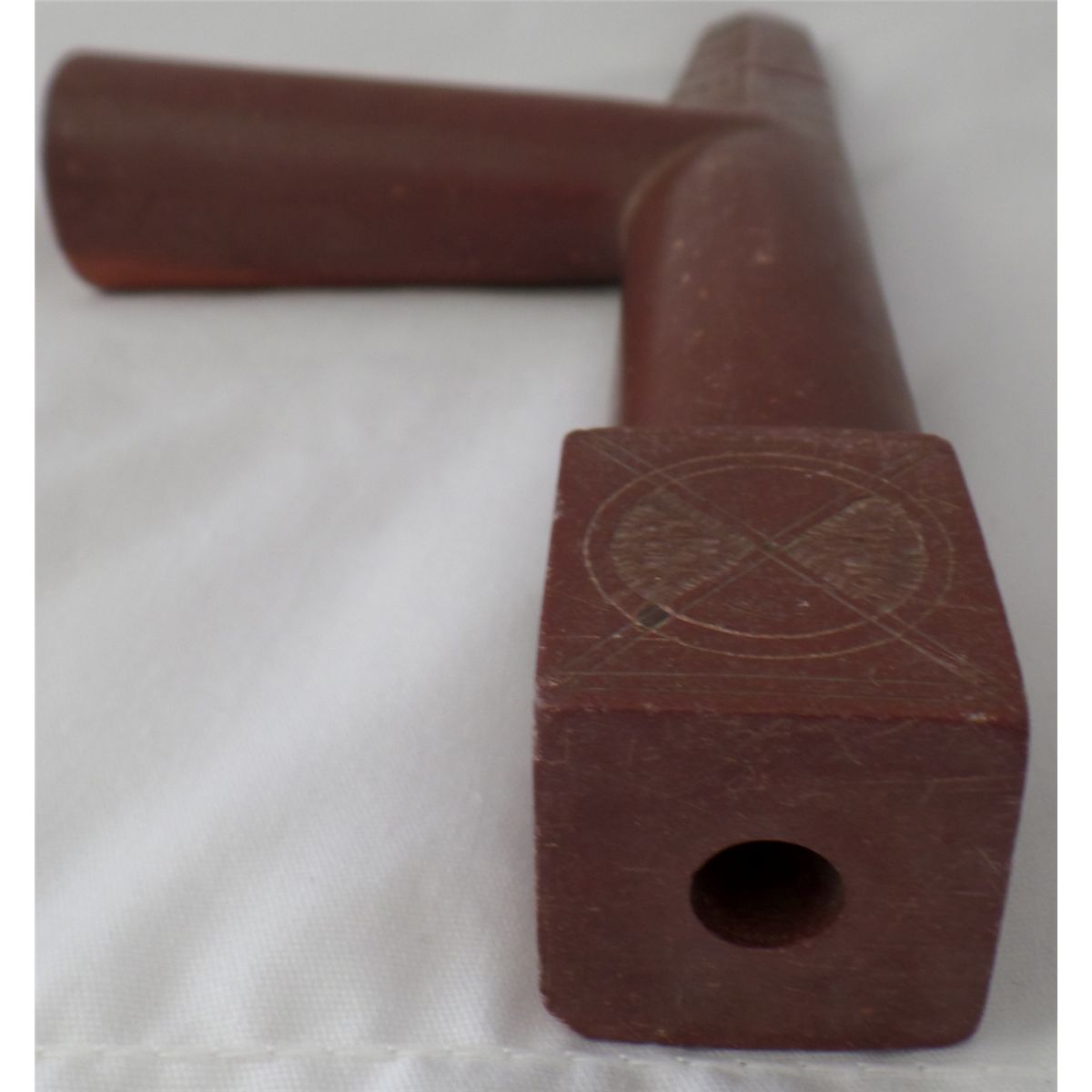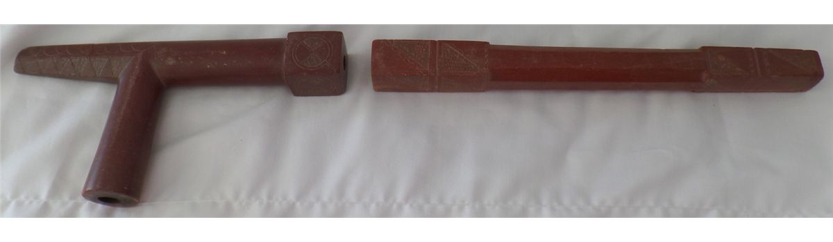 Catlinite Pipe & Stem from Minnesota. Circa 1890s. Item measures 20" long x 4.5" wide and weighs approx. 2 lbs. Condition: Handle has had a 2" break repaired, missing dowel to connect pipe and stem. Shipping: $20.
