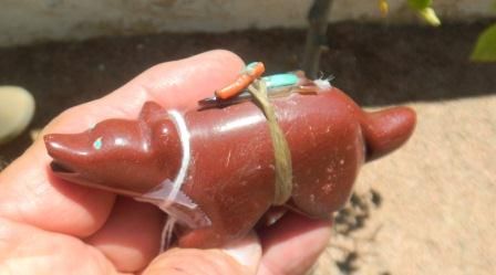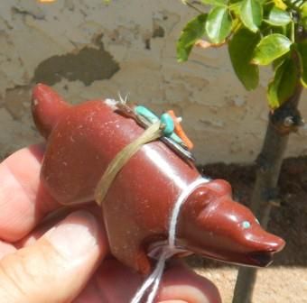 Zuni Fetish four by two by one inch. The piece has coral, turquoise and shell decoration on top. Fetish has turquoise eyes. Circa 1960 Fine Condition