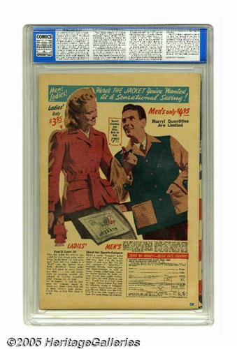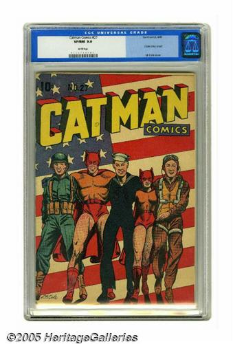<B>Catman Comics #27 (Continental, 1945) CGC VF/NM 9.0 White pages.</B></I> An L. B. Cole flag cover (with the Army, Navy, and Air Force all represented) is a great way to start off an issue, and there are more great artists inside the book, with Carmine Infantino, Bob Fujitani, Rudy Palais, and Don Rico all contributing. The origins of both Catman himself and his sidekick Kitten are detailed here. The issue is a Gerber "7," and one of only three copies that CGC has certified as of this writing (it's the highest-graded of the bunch). Overstreet 2005 VF/NM 9.0 value = $888; NM- 9.2 value = $1,200. CGC census 2/05: 1 in 9.0, none higher.