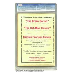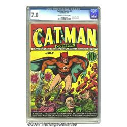 Catman Comics #3 (Holyoke Publications, 1941) CGC FN/VF 7.0 Cream to off-white pages. A classic Hitler, Stalin, and Mussolini cover by Charles Quinlan. The Pied Piper begins in this issue. Cat-Man collectors know how difficult it is to find many issues of this series, and especially difficult to find attractive copies in decent grade. This is the first copy of this issue that we've had the pleasure to offer at auction. To date, no other copies of this issue have been graded higher by CGC. Overstreet 2003 FN 6.0 value = $339; VF 8.0 value = $706. Important notice: Heritage usually auctions material at the rate of 200-250 lots per hour. On some occasions eBay Live bid software or the Internet may not be able to keep up with the pace of the auction. We recommend placing a realistic absentee bid now as insurance to avoid disappointment. Occasionally the auctioneer may eliminate or reject an eBay Live bid, and the auctioneer may also reopen a lot after the close of the eBay live bidding (usually because we missed an audience bid), and may reject your bid even if it shows you as the winning bidder. By bidding via eBay Live, you agree that Heritage may award the lot to another bidder at its sole discretion under the circumstances described above or any other reasonable circumstances. Since eBay bids are not shown to us until we open the lot on the floor, we treat those bids just like floor bids. In most cases the floor responds before the eBay bid is presented to us, due to Internet lag time, so for consistency we have made it a policy that floor bids are always considered first over tie eBay live bids. Also please note that all Heritage lots purchased through eBay Live carry a 20% Buyer's Premium. Please make sure you read the Terms and Conditions before you bid.