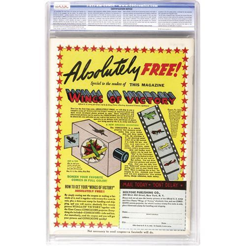 <B>Catman Comics #9 Mile High pedigree (Continental, 1942) CGC NM+ 9.6 Off-white to white pages.</B></I> This beautiful copy really wowed us. We know many a Golden Age collector who's extremely fervent about the Cat-Man, amazing for a character who hasn't appeared in comics since the 1940s (though the name was re-used for other characters by other companies). This copy is fantastically fresh, everything you'd want from a Mile High, and it's the only copy certified with a grade above 8.5 by CGC as of this writing. It's also got one of the better covers of the run - it's certainly the only comic we can think of to show a pre-teen girl machine-gunning a Japanese soldier! The girl is our hero's sidekick the Kitten, and the cover art is by Charles Quinlan. Young Joe Kubert is credited with the issue's Volton feature. By the way, for reasons known only to the folks at Continental, this issue is also known as V2#14, the number used in the indicia. Overstreet 2006 NM- 9.2 value = $900. CGC census 6/06: 1 in 9.6, none higher. <BR><BR><B>Important notice:</B> Heritage usually auctions material at the rate of 200-250 lots per hour. On some occasions eBay Live bid software or the Internet may not be able to keep up with the pace of the auction. We recommend placing a realistic absentee bid now as insurance to avoid disappointment. Occasionally the auctioneer may eliminate or reject an eBay Live bid, and the auctioneer may also reopen a lot after the close of the eBay live bidding (usually because we missed an audience bid), and may reject your bid even if it shows you as the winning bidder. By bidding via eBay Live, you agree that Heritage may award the lot to another bidder at its sole discretion under the circumstances described above or any other reasonable circumstances. Since eBay bids are not shown to us until we open the lot on the floor, we treat those bids just like floor bids. In most cases the floor responds before the eBay bid is presented to us, due to Internet lag time, so for consistency we have made it a policy that floor bids are always considered first over tie eBay live bids. Also please note that all Heritage lots purchased through eBay Live carry a 22.5% Buyer's Premium. Please make sure you read the Terms and Conditions before you bid. This lot is being auctioned in conjunction with a live floor auction by Heritage Auction Galleries. All final auction and invoice information will be supplied by Heritage Auction Galleries, and all other information should be considered preliminary. Lot:41001 <BR><BR><B>Winning Notification and Billing:</B> After the FINAL session in this auction is complete, Heritage will send e-mail and snail mail invoices. This process normally takes several days. All final auction and invoice information will be supplied by Heritage Auction Galleries, and all other information should be considered preliminary. <BR><BR>This auction will be conducted on a live auction floor and over the Internet through eBay Live. If you choose to place an absentee bid, please take a moment to <font color='#0000ff'><u><a href='http://pages.ebay.com/liveauctions/help/before/laabsentee.html'>learn how eBay Live absentee bidding works</a></u></font><font color='#000000'>
