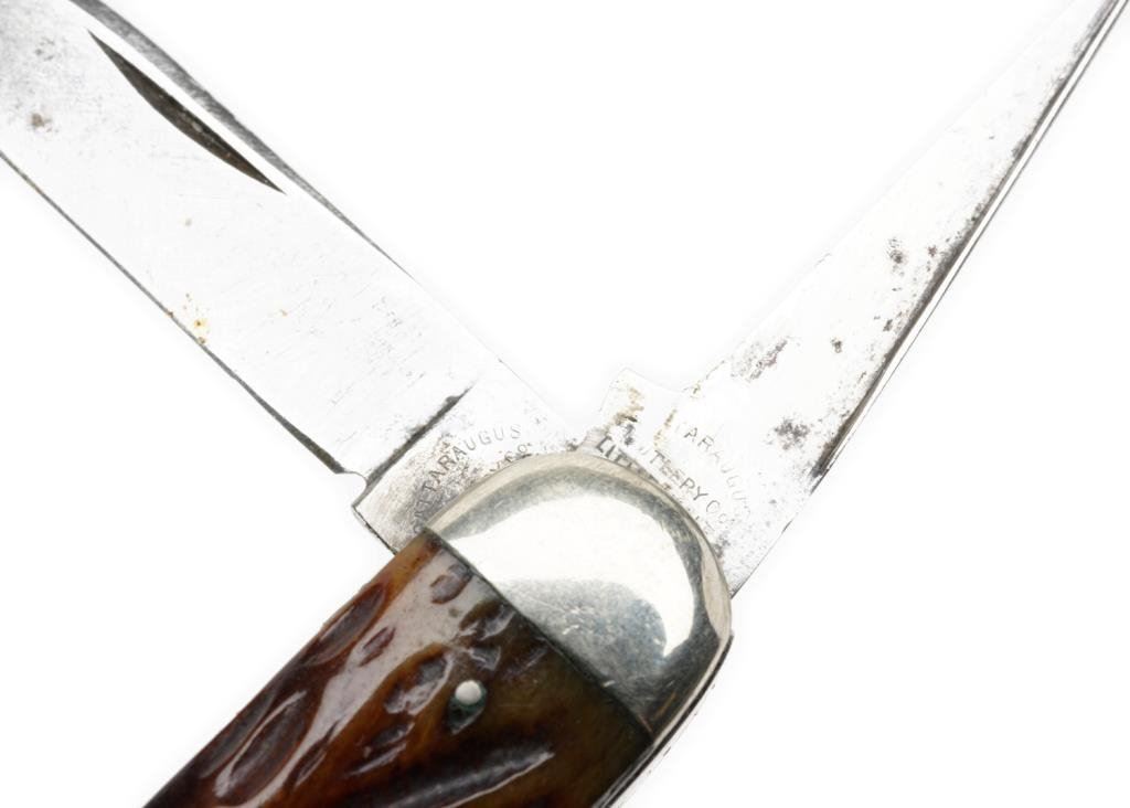 Cattaraugus Cutlery Co. multi-tool pocket knife with stag slabs, approximately 4.5” overall closed and in very good condition overall displaying a knife blade, a punching tool and an adjustable end wrench. Est.: $150-$300.