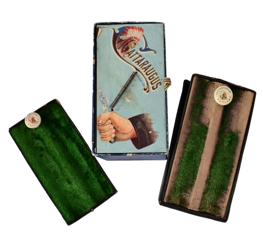 Pair of Cattaraugus Cutlery Company Pocket Knife Display boxes. Both boxes are empty.4 3/4" X 3" X 2 1/2".