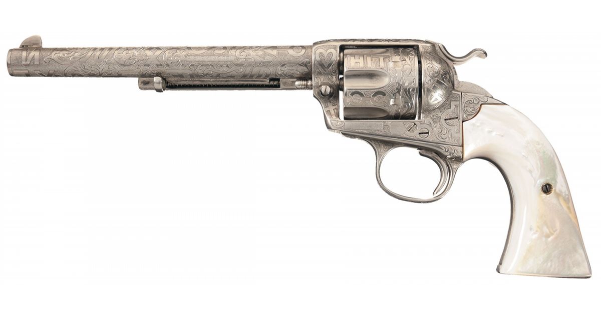 This is a nice example of a custom engraved Colt Single Action Army revolver that was manufactured in 1902 and subsequently custom engraved and embellished by the famous Master Engraver Cole Agee. The revolver is nearly completely covered with Texas cattle brand engraving and the brands are well executed in the typical western style with the recognizable "7UP", "XIT", "HIT" and many other famous Texas brands with intermixed floral scroll and a punch dot background. The only surfaces not covered are the front strap, the inside area of the trigger guard, the cylinder flutes and the hammer (the latter Agee never engraved when doing the cattle brand engraving). The top of the ejector housing has a floral scroll pattern. The top of the barrel is marked with the two line address, the left side is marked "BISLEY MODEL" in a panel and the left side of the frame is marked with the two line, three patent dates, (faded), followed by a very faint circled Rampant Colt. The matching serial number appears on the bottom of the frame, trigger guard and the back strap. Standard blade front and frame notch rear sights, all nickel finish and fitted with smooth pearl grips. The revolver is accompanied by a letter dated February 26, 1993 from an individual who met Cole Agee in 1950 and had him engrave a revolver for him and examined the engraving on this gun and feels that it was Engraved by Agee stating, "The style and tools used are correct for his work." It is estimated that Cole Agee only did 15 to 20 of these Texas cattle brand guns.