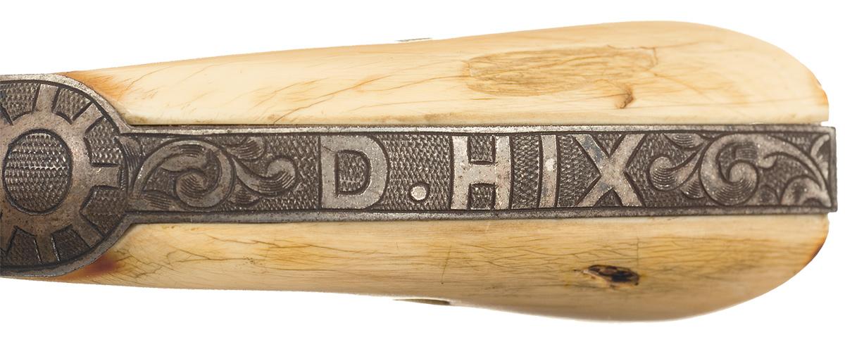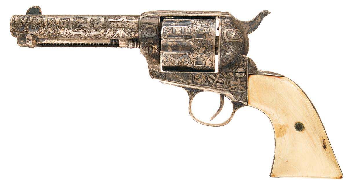 This Colt Single Action Army revolver was manufactured in 1903. The revolver was subsequently engraved by Cole Agee in the 1950s with his distinctive cattle brand engraving. All of the exterior surfaces of the revolver with the exception of the hammer and cylinder flutes are engraved with Western cattle brands on a stippled background. At least thirty-four separate brands are visible on the revolver. The backstrap has the name "D. Hix" incorporated into the style of engraving (history unknown). The revolver has a silver-plated finish and is fitted with two-piece ivory stocks. The top of the barrel is roll-stamped: "COLT'S PT. F.A. MFG. Co./ HARTFORD CT. U.S.A." in two lines in an oval panel. The left side of the barrel is roll-stamped with the caliber: "38 W.C.F" in a panel with oval borders. The left side of the frame is stamped with the Colt, 'three-date in two-line' patent marking followed by the encircled Rampant Colt trademark. The full serial number, "242980" is located on the bottom of the frame, trigger guard and backstrap. All of the visible serial numbers match. The inside of the loading gate is stamped with the partial serial number "4921".