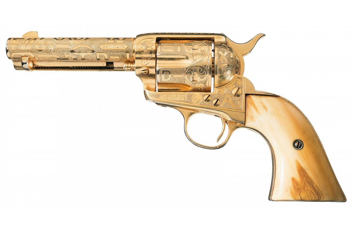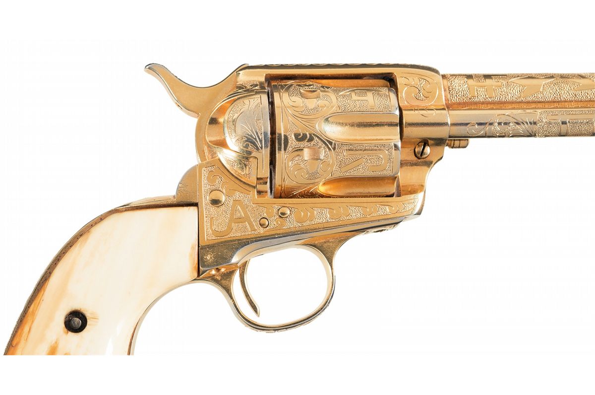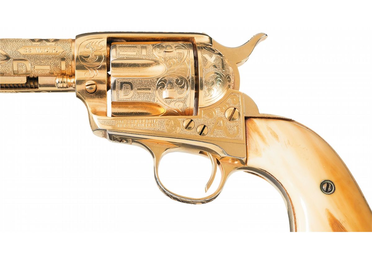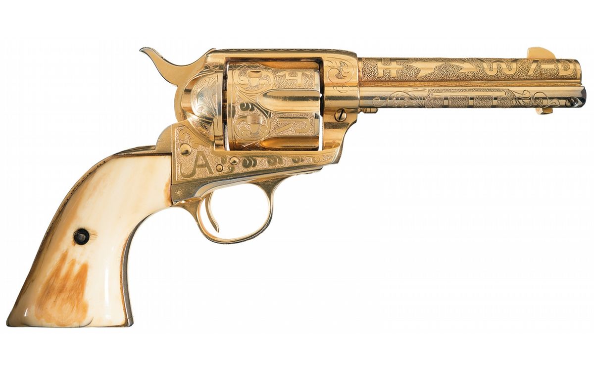 Manufactured in 1903 and subsequently custom engraved with a cattle brand motif. The revolver is nearly completely covered with cattle brand and floral scroll engraving much in the style of Cole Agee, Weldon Bledsoe or David Harris. The engraving is well executed in the typical western style with the recognizable "XIT", The Running "W" and many other famous Texas brands with a stippled background. The only surfaces not covered are the upper portion of the front strap, the inside area of the trigger guard, the cylinder flutes and the hammer. The top of the ejector housing has a simple wavy line and dot design. The top of the barrel is marked with the two address, "32 W.C.F." on the left side and the two-line, three-patent dates are marked on the left side of the frame followed by the circled Rampant Colt. The matching serial number appears on the bottom of the frame, trigger guard and the back strap. The entire revolver is gold plated and it is fitted with poorly fit undersize ivory grips.