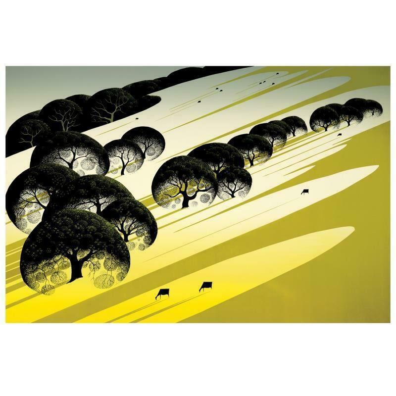 "Cattle Country" is a limited edition serigraph on paper by Eyvind Earle (1916-2000). The piece is numbered, hand-signed by the artist, and accompanied by a certificate of authenticity. Measures approximately 20" x 30" (image).