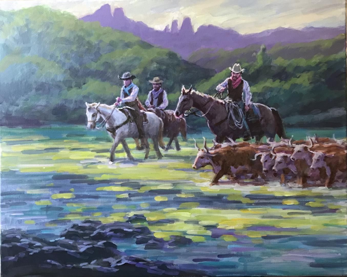 Cattle drivers take the herd across the river. An original 24x30" acrylic on stretched canvas by Richard Ho. w/COA.