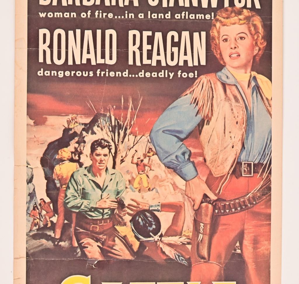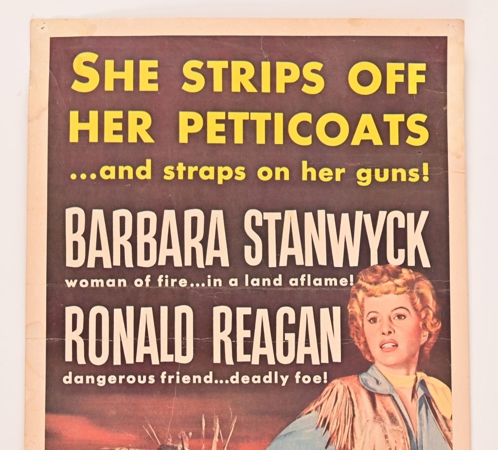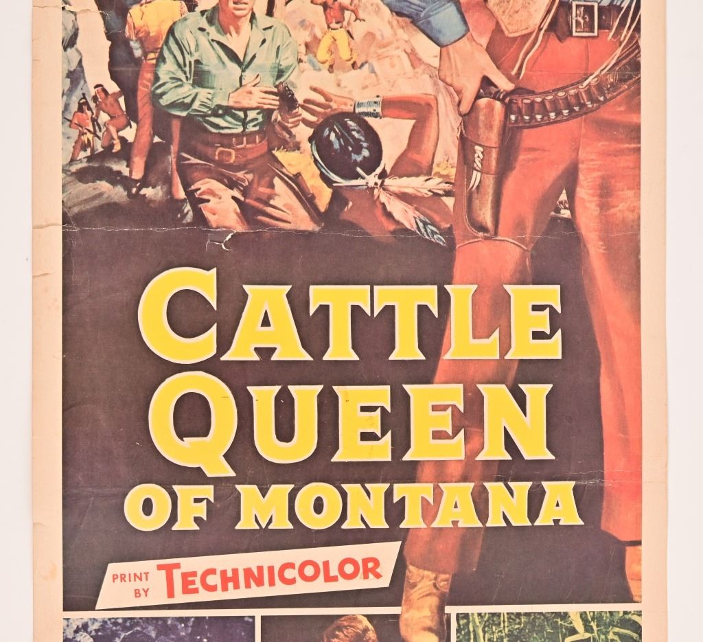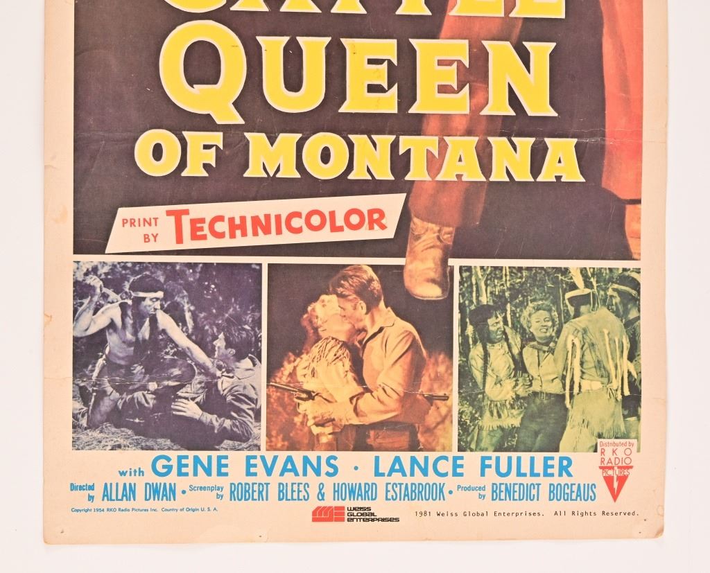 Color 1981 poster print of "Cattle Queen of Montana", starring Ronald Reagana dn Barbara Stanwyck. Weiss Global Enterprises, of which produced the original movie in 1954. Colorized later production movie poster, 14x36