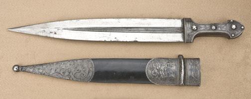 Caucasian Kenjal dagger with niello silver mounts and original scabbard circa 19th century. The dagger measures nearly 20” overall with 14-7/8” blade. The blade measures nearly 2-1/4” across widest part and shows two blood grooves down the center where there appears to be a watered type pattern in this central area. The silver mounts show some wear, scratching. The original scabbard is good. The back of thethroat shows signature and what may be a date. This is an original ethnic piece, not to be confused with current copies. There has been a small repair to the tip of the scabbard, gluing back the ball tip. Est: $600-1200