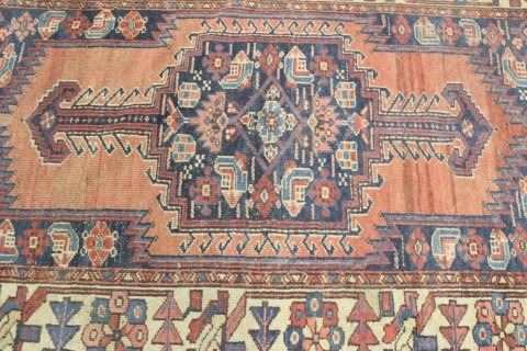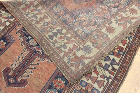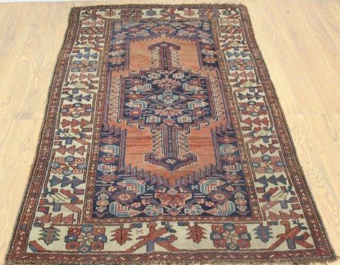 Circa 1920s. Geometric pattern. Red background with blue center. Approx. 4' x 7'. Ends frayed, otherwise good condition.