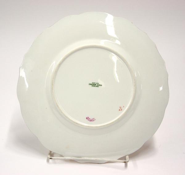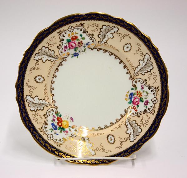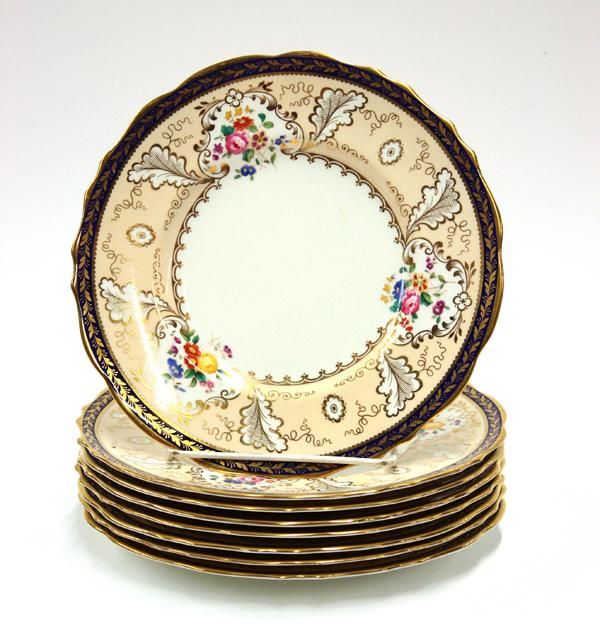 (Lot of 8) Cauldon porcelain service plates, each having a gilt and cobalt decorated rim surrounding the polychrome border having floral reserves, marked with underglaze green mark, and retailed by Tiffany and Company, New York, 10.5''w