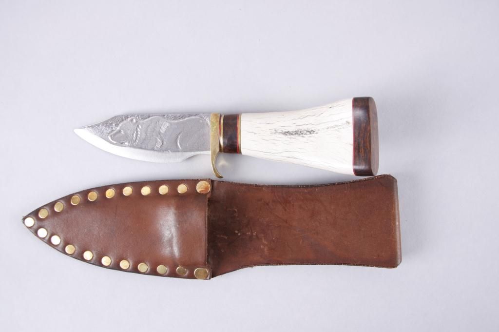 Cavalier Custom Knife with Carved Bear4" stainless blade, 8 5/8" overall length, antler handle inla