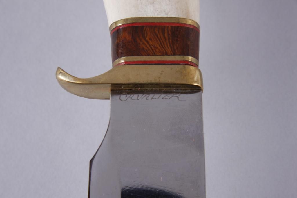 Cavalier Custom Knife with Carved Bear4" stainless blade, 8 5/8" overall length, antler handle inlaid hardwoods, in like new condition.
