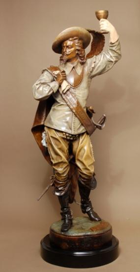 Auguste Poitevin's classic bronze of a French cavalier officer has been cast of the finest pure bronze by the talented artisans working in our own California art foundry, and boasts a stunning patina finish. "Cavalier" is mounted onto a marble base, stands a full 34" tall by 12" wide, and is signed "Auguste Poitevin" in the bronze.
