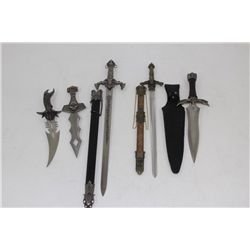 short sword approx 29" , short sword approx 24", 3 daggers 1 with leather sheathe approx 19" , approx 15", approx 16"
