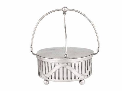 Silver, 227 g. Raised on ball feet, hinged cover, blown, tintless glass lining. Marked: Austrian, circa 1910, Lippa und Co. Neuwirth: II/28. Size: 15.5 cm