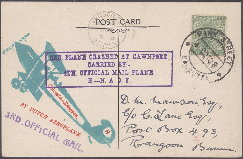 KGV, 1928,Air MailPost Card, 1/2a, By Dutch aero plane to Rangoon,, signed by pilotJohn PrattRoss Hadleyon front,Cancelled at Park Street Calcutta on 4 Oct 1928 with Rangoon dely on back 16 Oct 1928,VioletLarge violet cachet 3rdPLANE CRASHED AT CAWNPORE. CARRIED BY:- 4THOFFICIAL MAIL PLANE. H ---N A.D.F.,Signed by Stephen Smith on back,Excelent Condition.