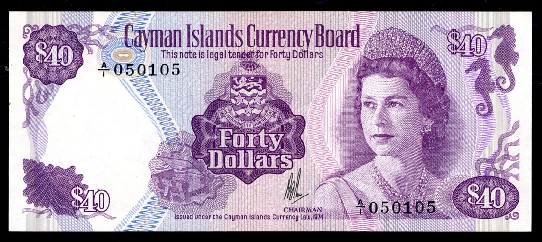 Cayman Islands, Fourty Dollars, 1974, P#92. An unusual relatively high denomination note. A nice uncirculated. S/N : A/I : 050105. Catalogue $290 cdn