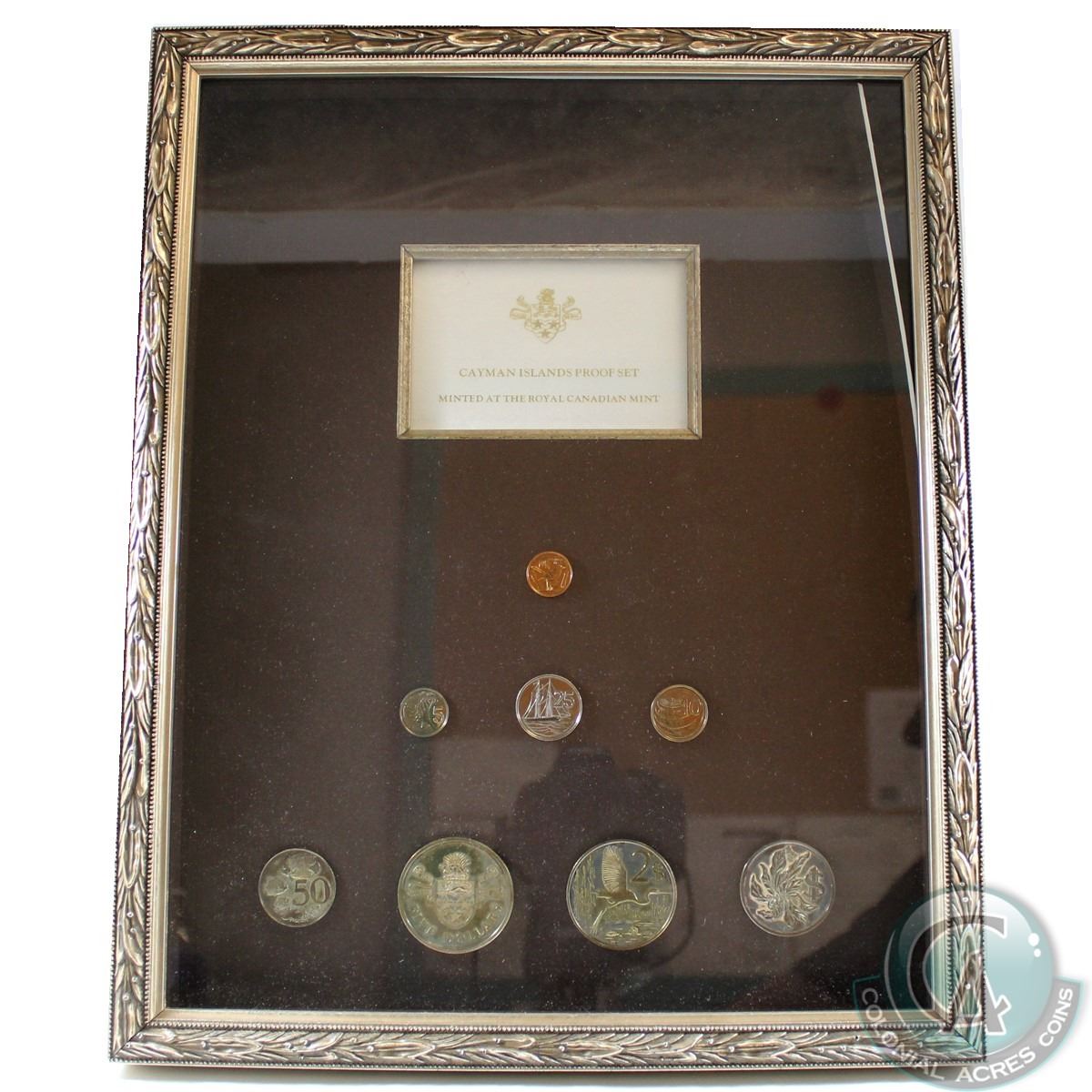 Cayman Islands Proof 8-coin Set inside Large Metal Frame. This Set contains a Sterling Silver 50-cent, $1, $2 & $5 containing 2.77oz of Pure Silver. The Set is of unknown date (coins are toned)