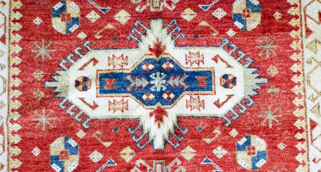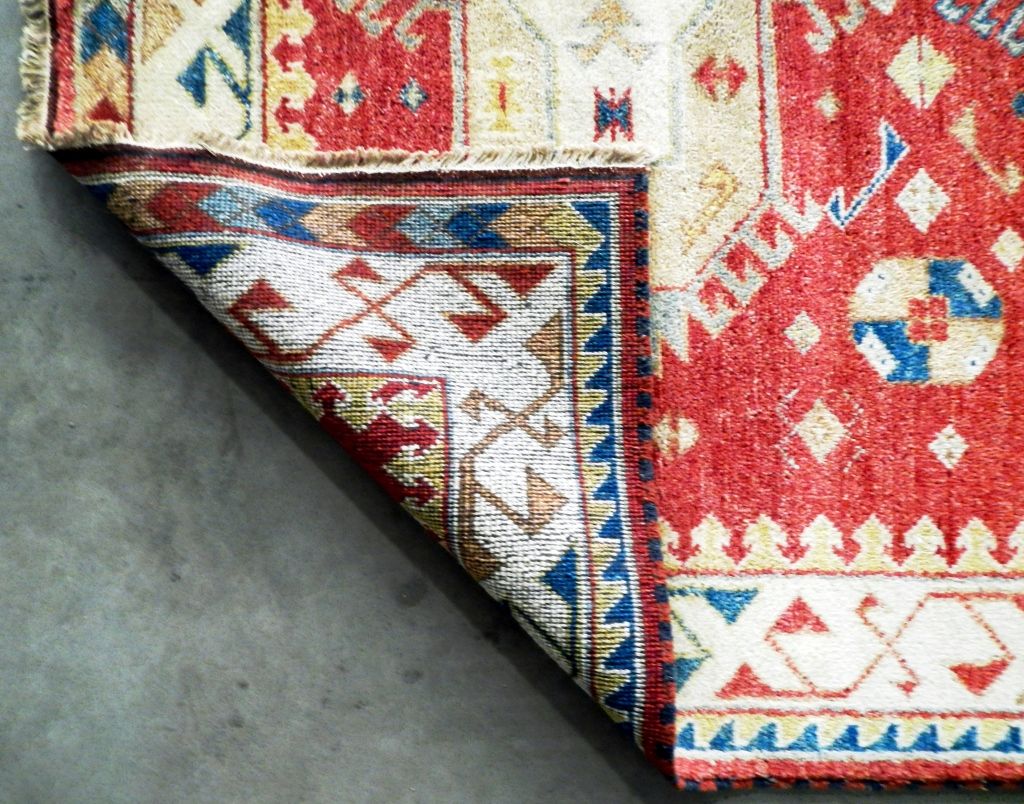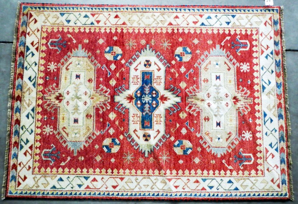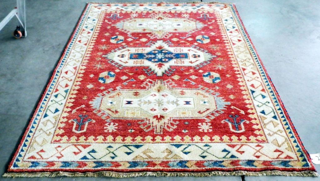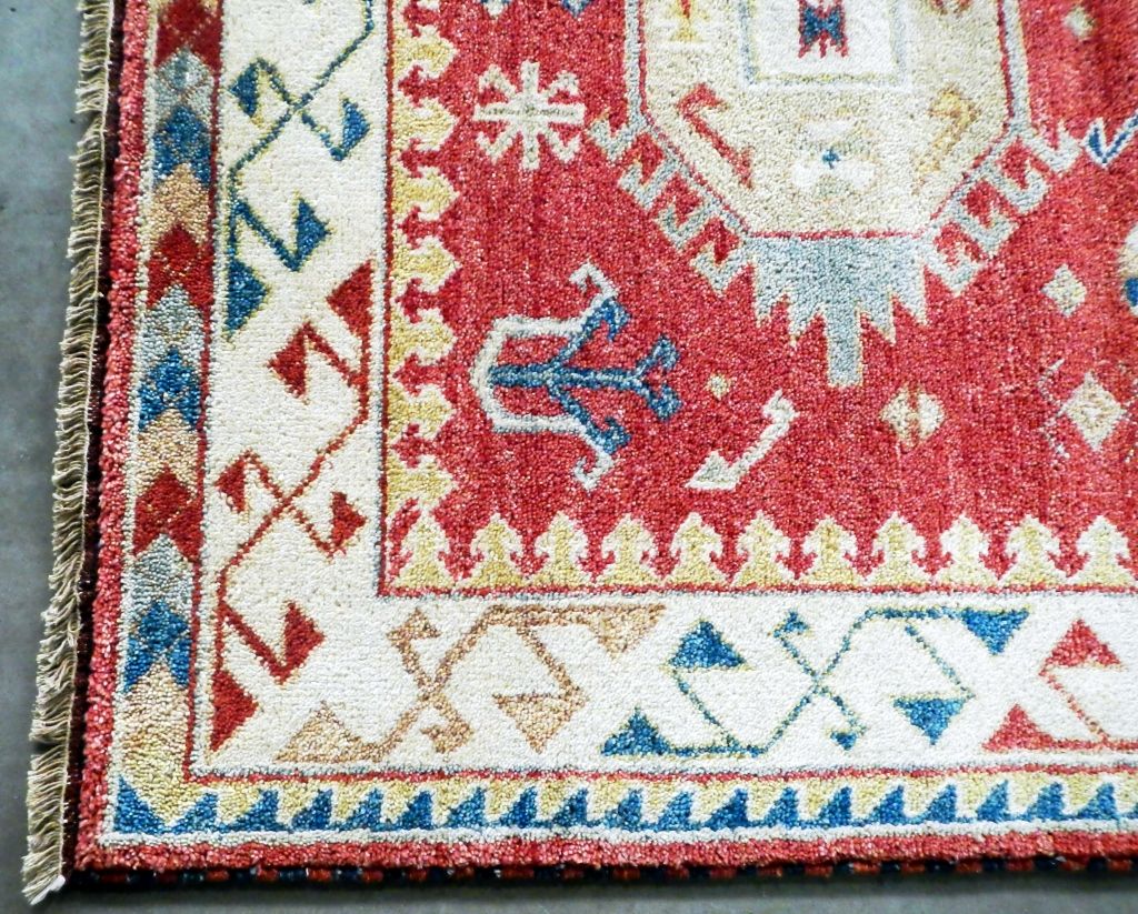 Cazak Rug Hand Woven in India with Color Fast Chrome Woven Dyes. Cazak originated in the Caucasus Mountains. 100% Wool Rug. Cazak Pattern. Size is 5.9'x7.11'