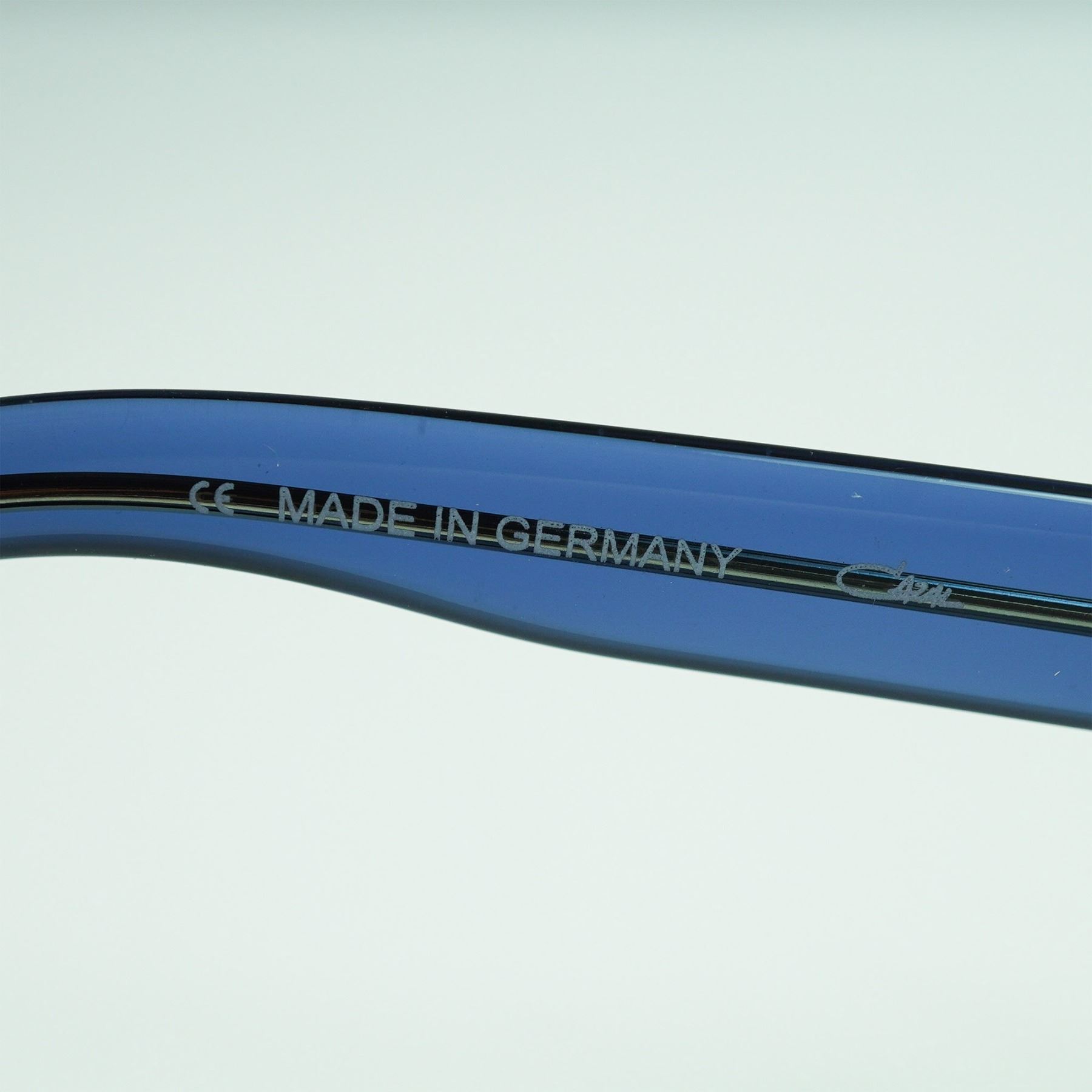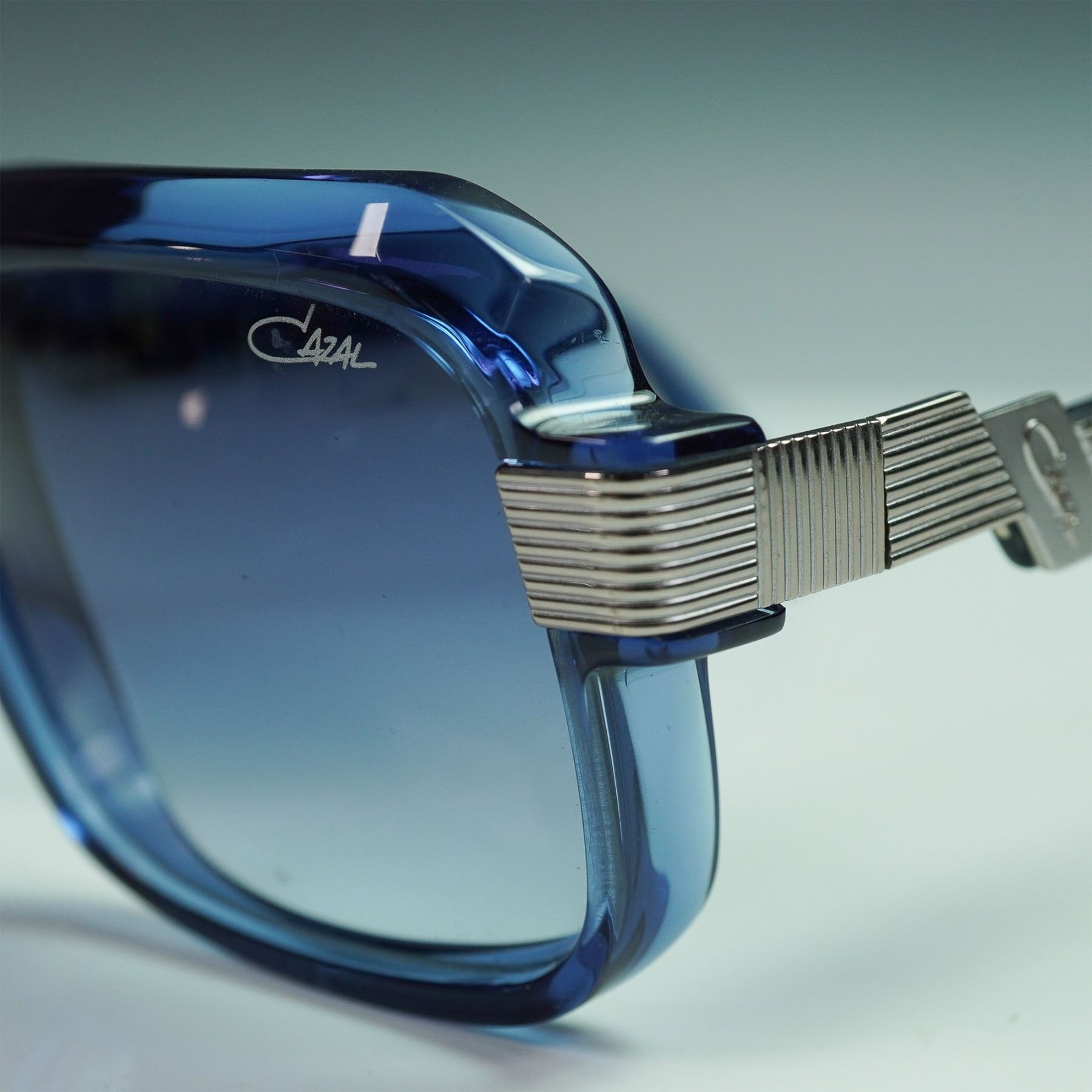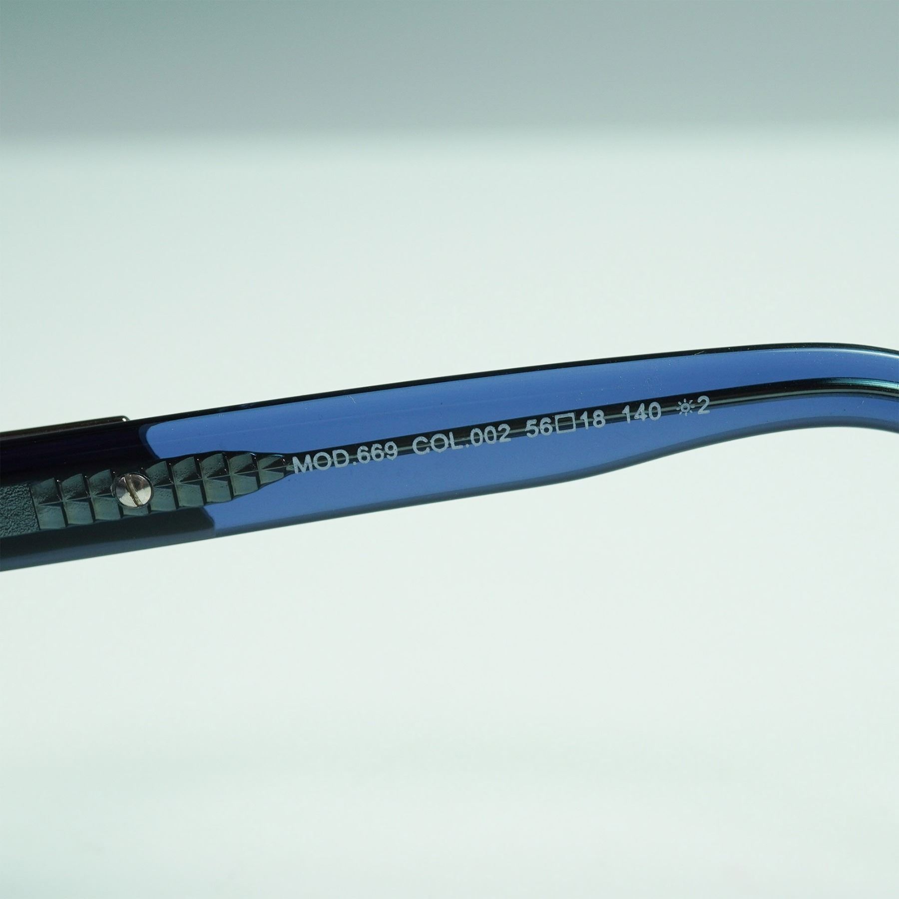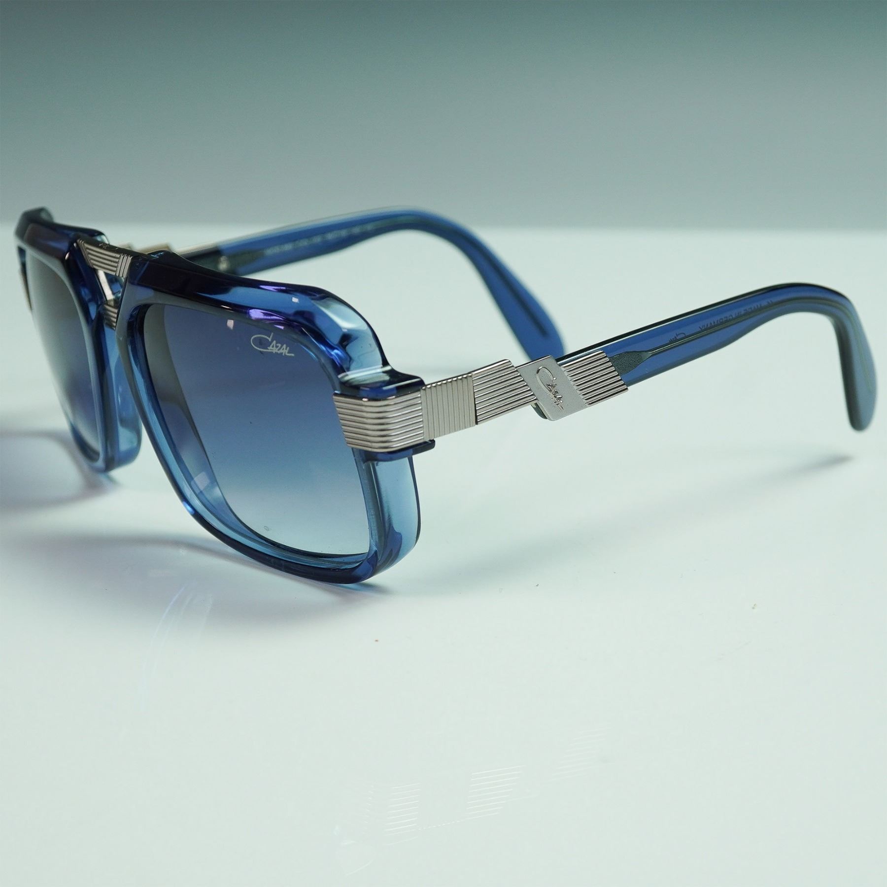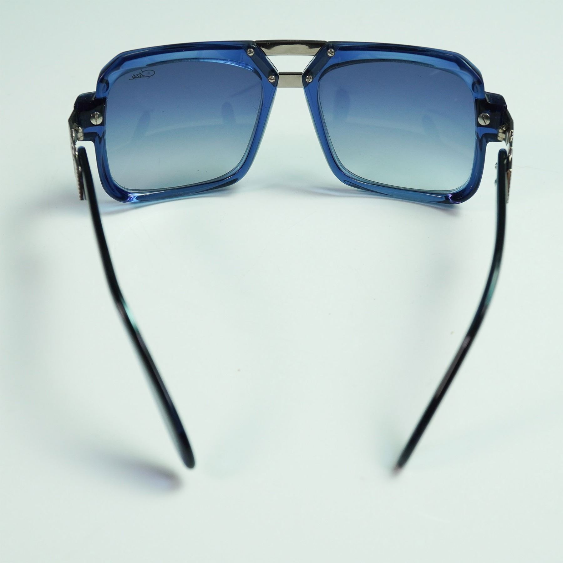 Striking pair of Cazal MOD 669 sunglasses featuring bold square frames in translucent blue with matching gradient lenses. The metal detailing at the bridge and temples showcases the brand's signature retro-futuristic aesthetic. Stamped "Made in Germany" on the inner temple, along with model and size details: MOD.669 COL.002 56 18 140. The right lens is subtly etched with the Cazal logo
