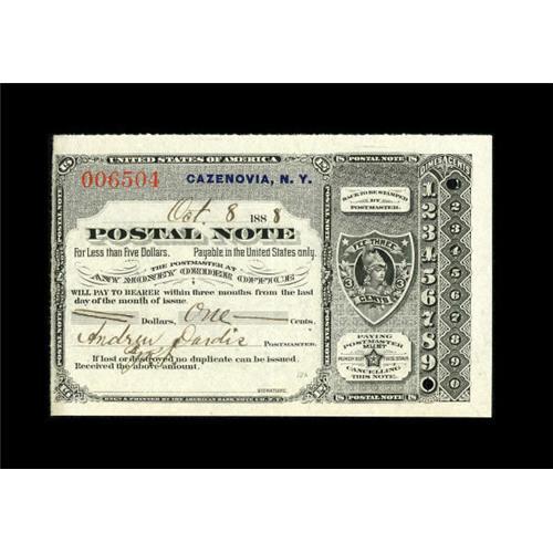 <B>Cazenovia, NY- Postal Note</B></I> 1¢ Oct., 1888<BR> The last of the three Cazenovia Postal Notes, this bought in 1888 for one cent. It will bring more than that tonight. <B>About Uncirculated.</B></I><BR><BR><b>Shipping:</b> Coins & Currency (<a target="_blank" href="http://www.heritageauctions.com/common/shipping.php">view shipping information</a>)