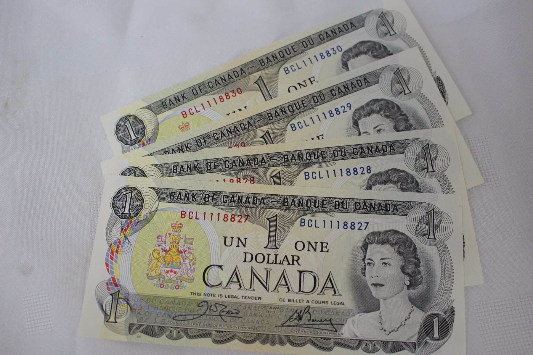 Cdn. Dollar Bills (4) 1973 - 4 sequenced bills