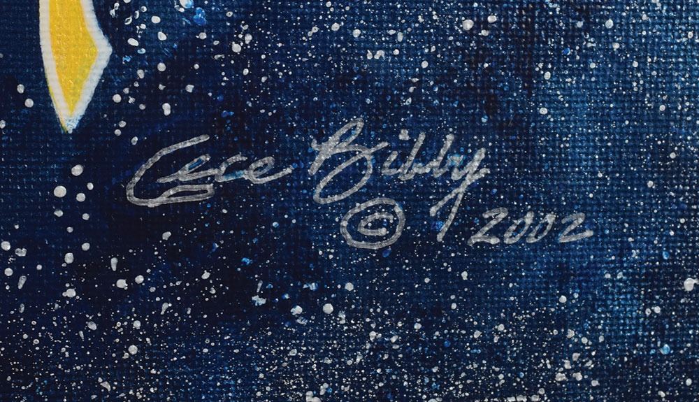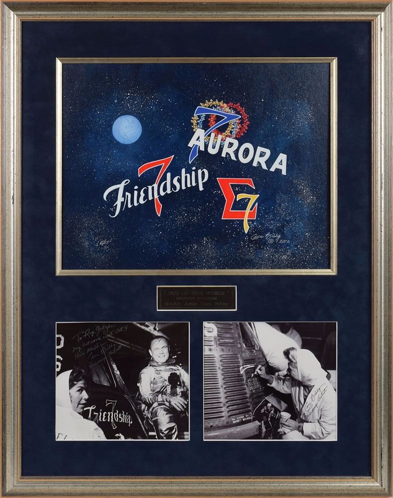 Limited edition original painting of the Friendship 7, Aurora 7, and Sigma 7 mission emblems, accomplished in acrylic on a 17.25 x 13.25 artist’s canvas panel, numbered 6/15, signed in the lower right in silver ink by the artist, "Cece Bibby, 2002." Handsomely matted and framed with an engraved plate and two satin-finish photos to an overall size of 25.25 x 32; one photo depicts Bibby next to John Glenn, signed and inscribed in silver ink, "To Roy Gutzke: My artwork went out of his world, Cece Bibby, Mercury artist," and the other shows Bibby painting the Aurora 7 logo, signed in black felt tip, "Cece Bibby, Mercury artist." In overall fine condition. In 1959, Bibby was hired by Chrysler Aerospace and soon began work as a contract artist for NASA, her workspace located just across the street from the astronaut office. Not a fan of the stencil designs on the Freedom 7 and Liberty Bell 7, John Glenn recruited Bibby in 1962 to design and paint by hand the emblem for his Friendship 7 spacecraft. In addition to Glenn, Bibby went on to create the designs for Scott Carpenter's Aurora 7 and Wally Schirra's Sigma 7 capsules, subsequently becoming the first and only woman to ascend the Mercury launch gantry and go inside the ‘white room’ that surrounded the vehicle. A wonderful Mercury-related display piece.