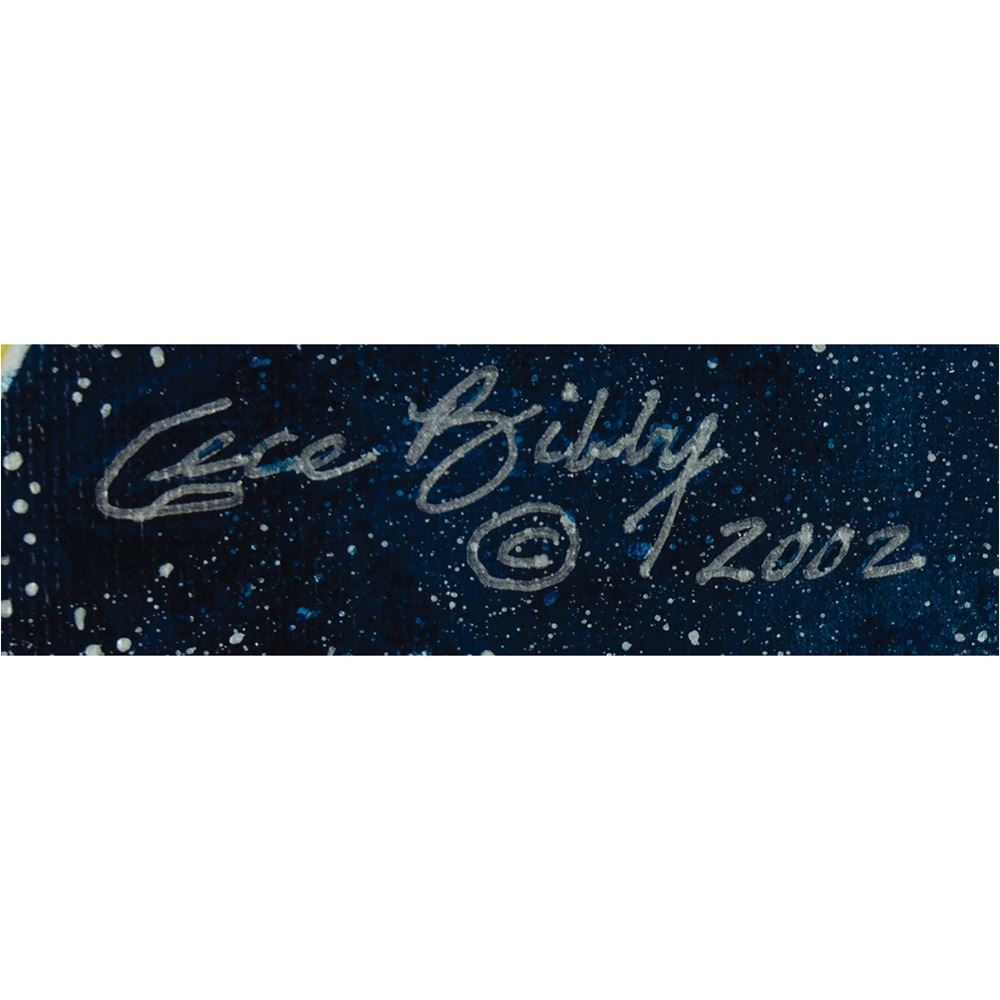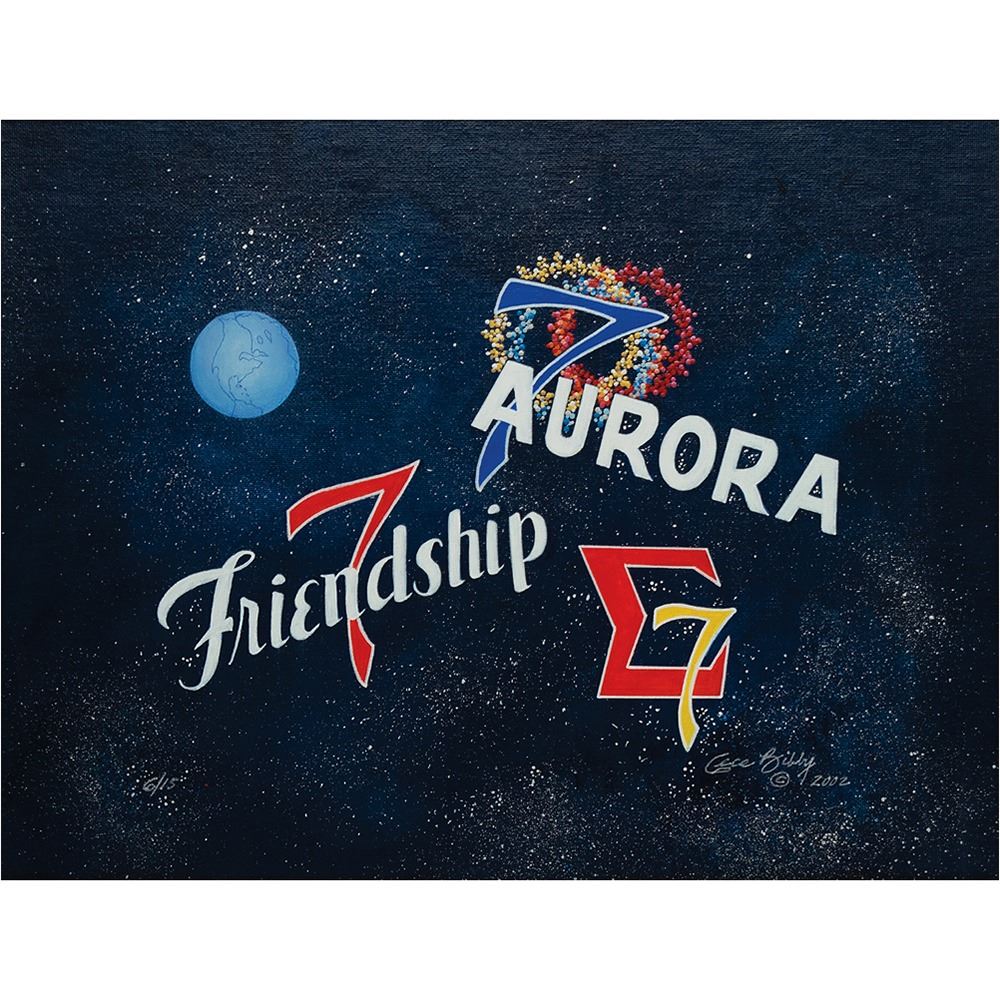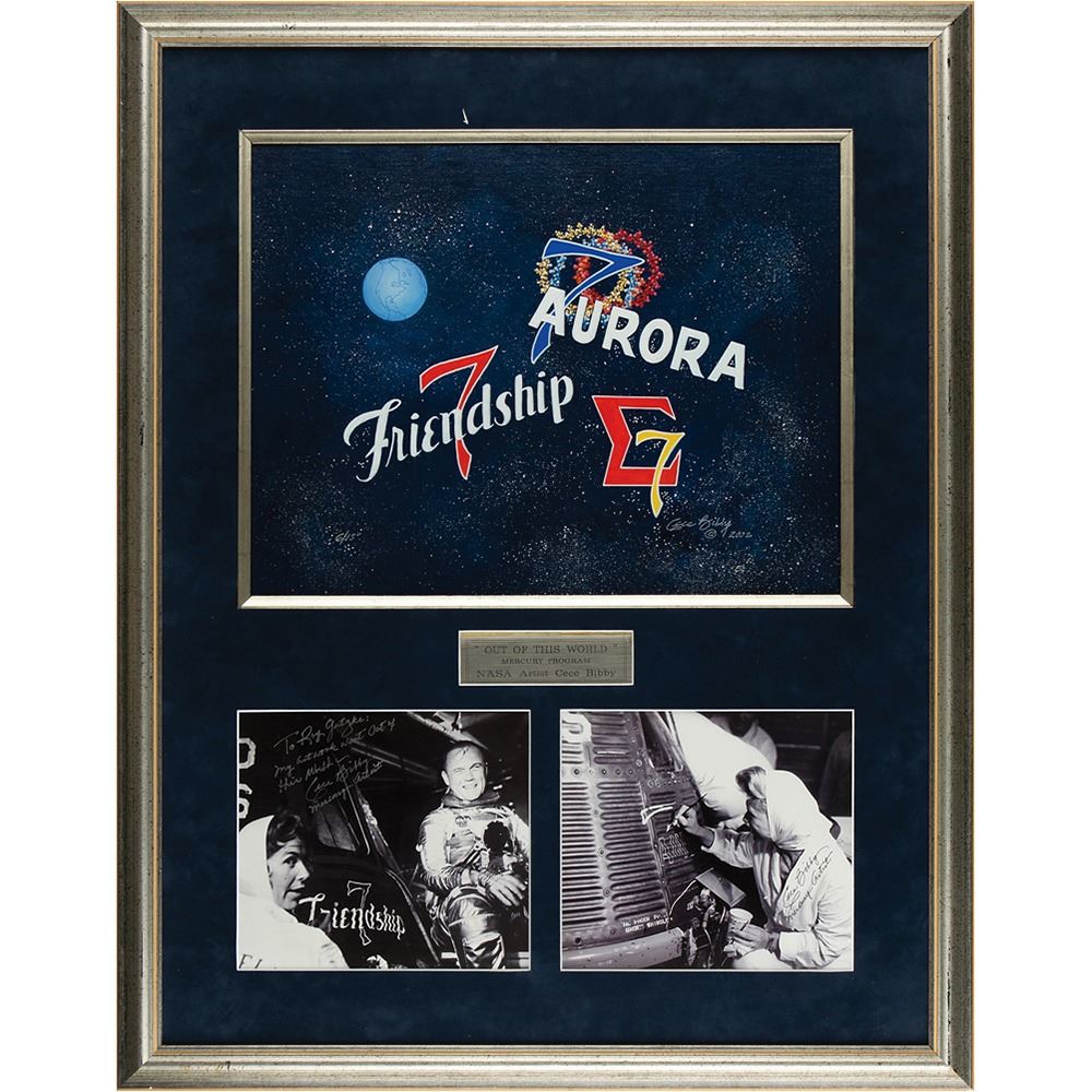 Limited edition original painting of the Friendship 7, Aurora 7, and Sigma 7 mission emblems by Cece Bibby, accomplished in acrylic on a 17.25 x 13.5 artist's canvas, numbered 6/15, signed in the lower right in silver ink, "Cece Bibby, 2002." Matted with a plaque and two satin-finish 8.5 x 7.5 photos, one of Bibby next to Mercury astronaut John Glenn and his Friendship 7 capsule, which is signed and inscribed in silver ink, "To Roy Gutzke: My artwork went out of this world-Cece Bibby, Mercury Artist," and another of Bibby painting the insignia on Scott Carpenter's Aurora 7 spacecraft, signed in black felt tip, "Cece Bibby, Mercury Artist." Framed together to an overall size of 25.25 x 31.75. In overall very fine condition.